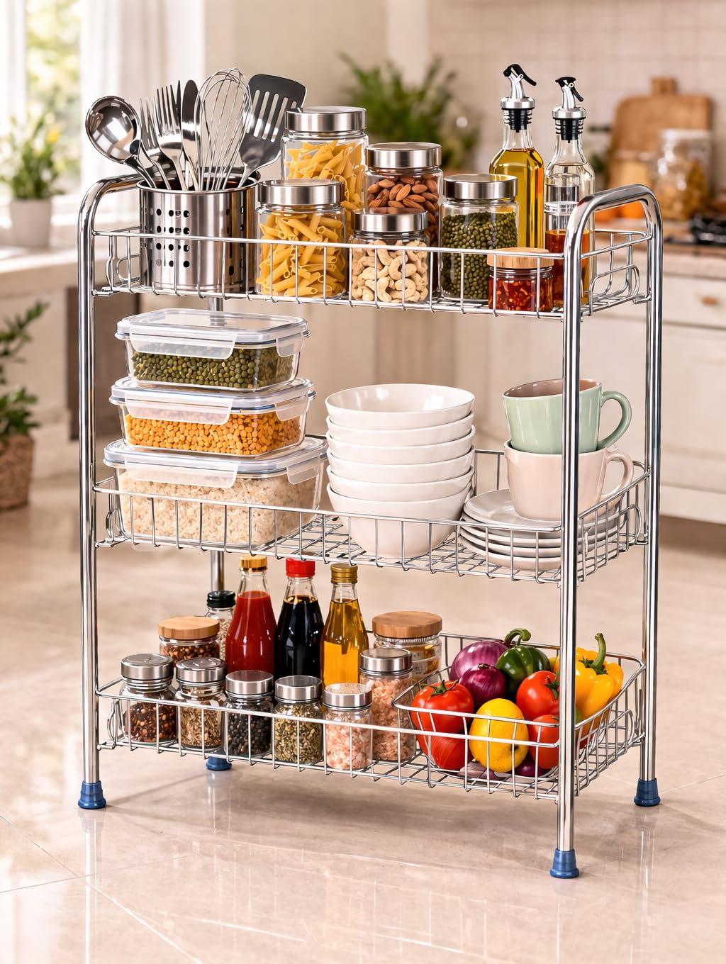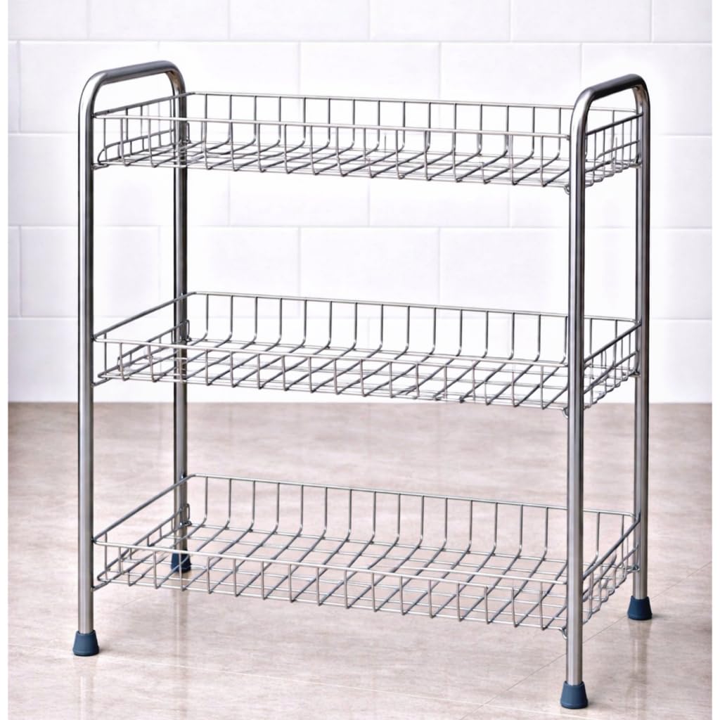 VERSATILE STORAGE: Three-tier stainless steel rack perfect for organizing spices, jars, containers, and kitchen essentials with sturdy construction for long-lasting use
