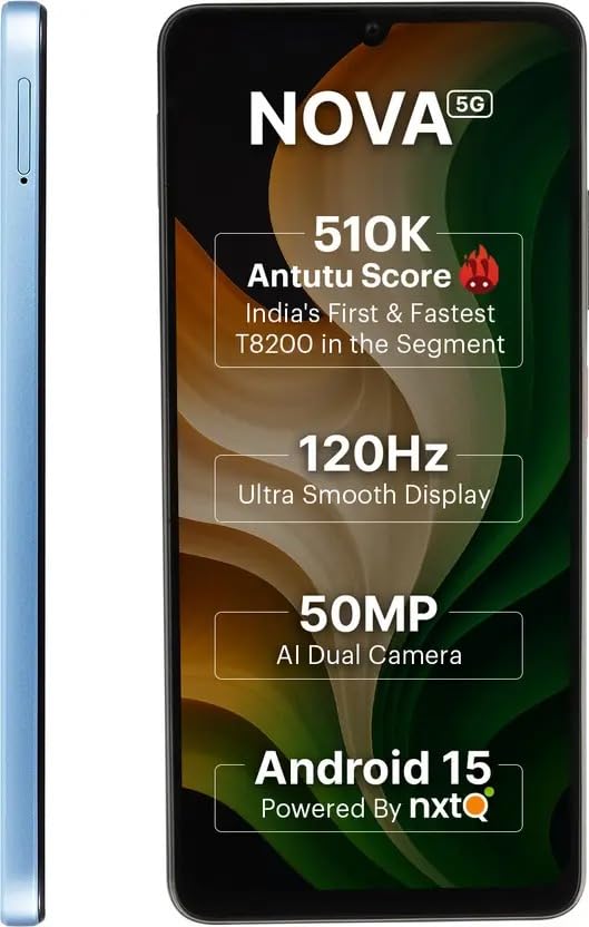 The Ai+ Nova smartphone comes with the Unisoc T8200 8-core processor with a 510K+ AnTuTu score for smooth performance. Enjoy blazing fast 5G connectivity with Dual SIM, ideal for smooth multitasking. Capture stunning shots with the 50 MP AI dual camera and watch ultra-smooth visuals on a 120 Hz screen. Powered with Android 15 with nxtQ, it offers improved speed, personalization, and built-in privacy features to safeguard your data in place.
