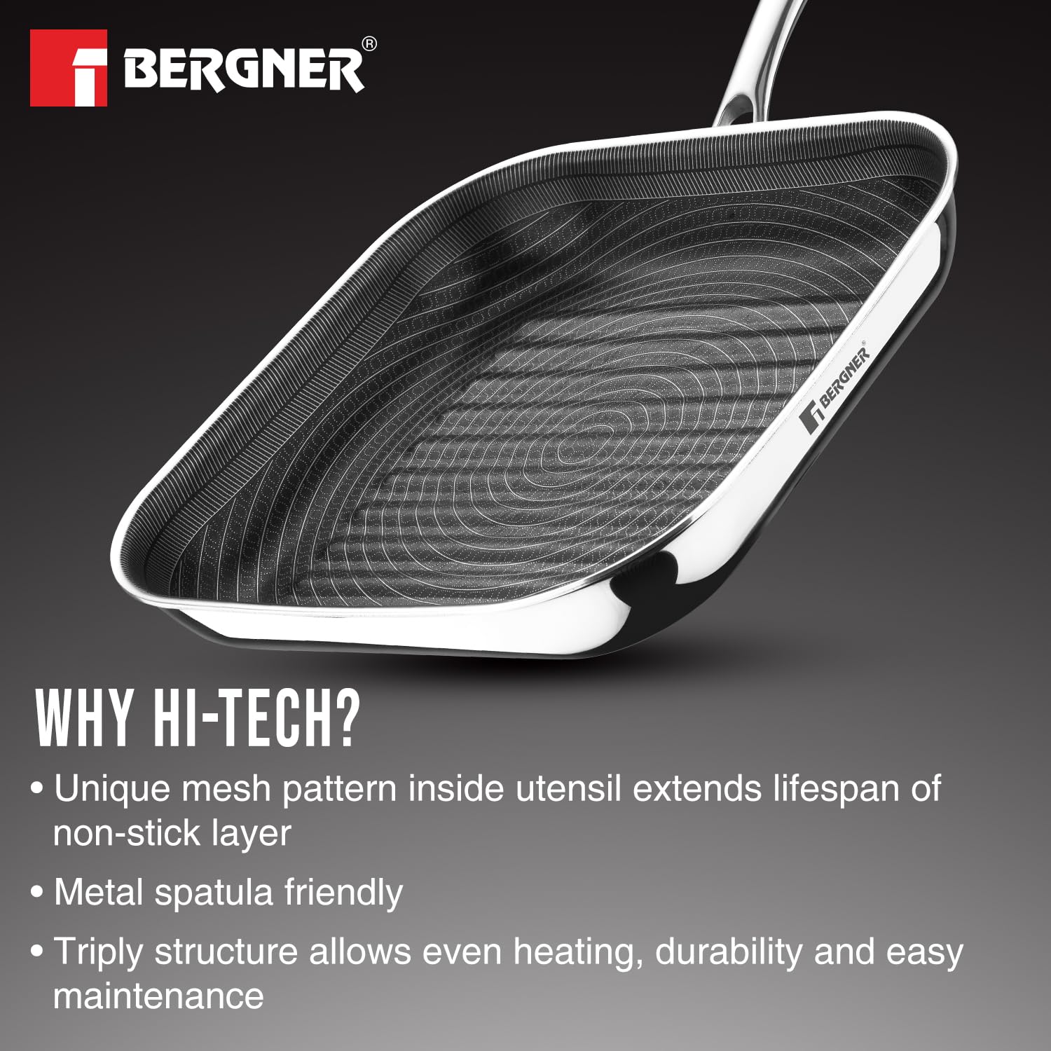 Bergner Triply Hi-Tech Giro Stainless Steel Non-Stick 24cm Grill Pan is a versatile and durable cookware piece designed for healthy and efficient grilling. Crafted from high-quality stainless steel, this grill pan ensures even heat distribution, preventing hot spots and burning, allowing you to cook with less oil and maintain the integrity of your food. The tri-ply construction consists of an inner layer of 18/10 stainless steel for non-stick cooking, a middle aluminum layer for efficient heat conduction, and an outer layer of 18/0 stainless steel for induction compatibility. The interior Giro Mesh and Ilag Ultimate Coating provide an exceptional non-stick surface, reducing the need for excessive oil and making cleaning a breeze. The ribbed surface creates beautiful grill marks on your food, giving it a restaurant-quality finish. With its metal spoon-friendly coating, you can use your favorite utensils without worrying about scratching the surface. This grill pan is perfect for grilling a variety of foods, from steaks and burgers to vegetables and seafood.