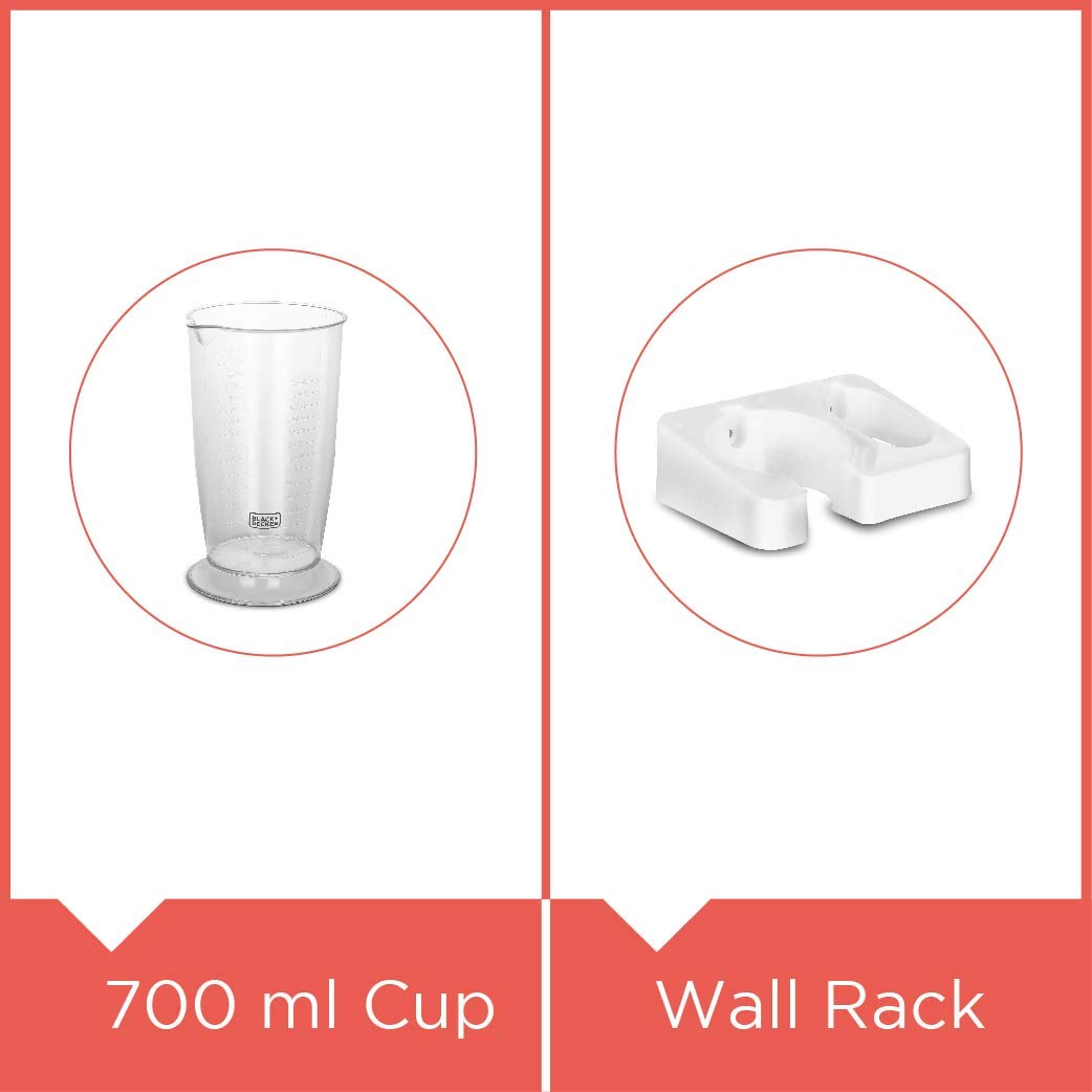Everyday chopping and blending in the kitchen just got easier with the Black+Decker 600W Hand Blender! From whisking eggs to get the perfect, fluffy omelette to chopping onions and other veggies for a quick dinner preparation. Designed with a stylish slim and a smooth touch body, this product comes with a 700ml cup, wall rack and a removable blender shaft for added utility. Make delicious smoothies in a wink of an eye in the 700ml measuring cup, which comes with a rubber mat. Catering to the most needs in any kitchen, the 600W Black+Decker Hand Blender is an all-rounder!
