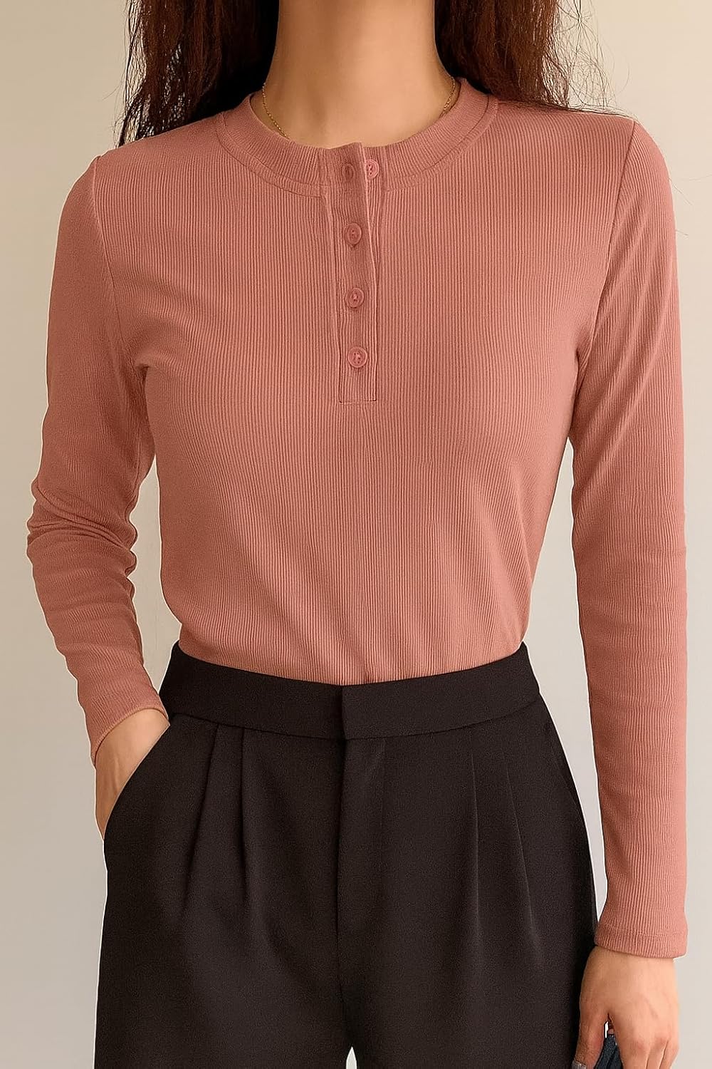 Premium Ribbed Knit Henley Top for Women – Ultra Soft Long Sleeve Slim Fit T-Shirt with Button Detailing