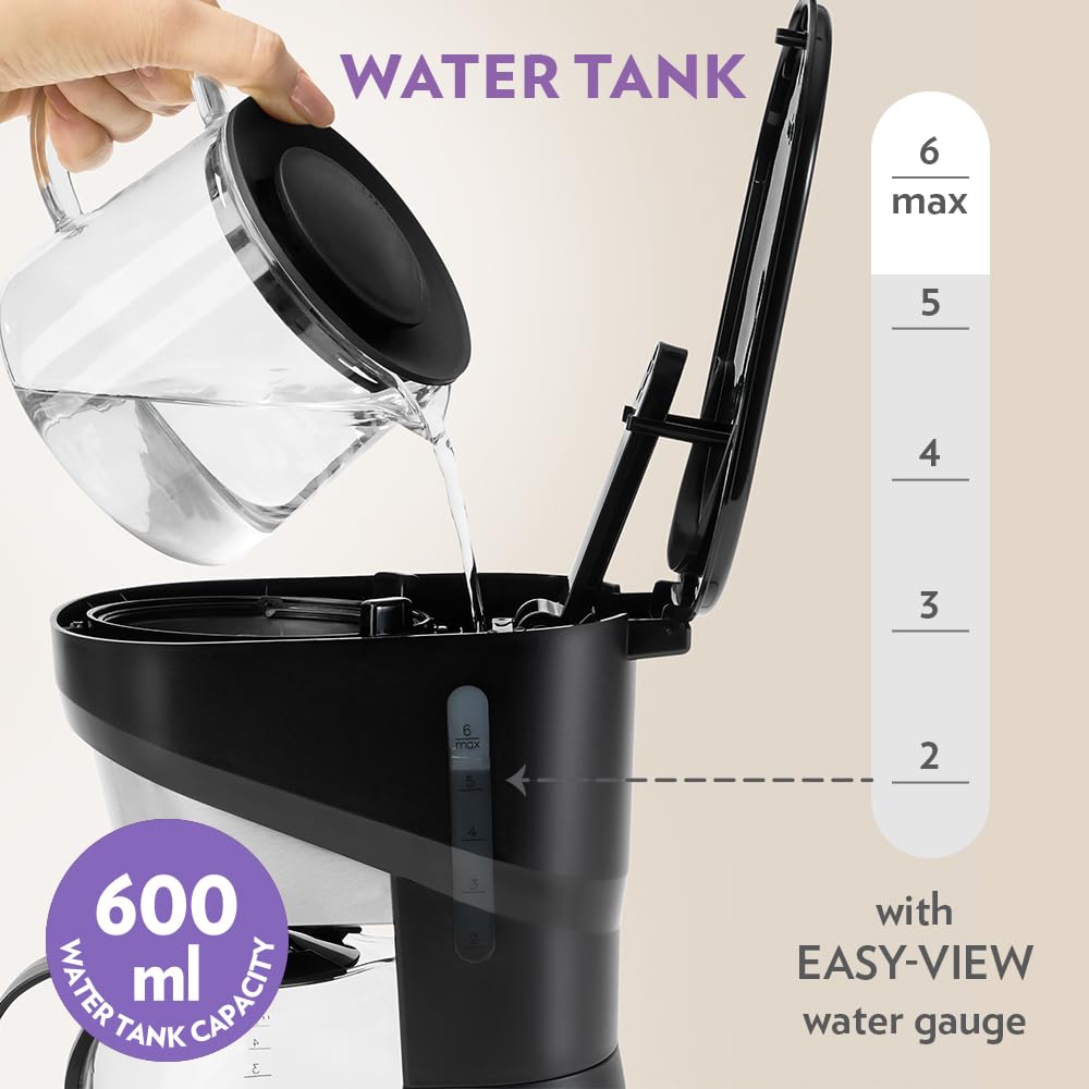 600ml Capacity Borosilicate Glass Carafe: Makes 4-6 large cups of coffee with easy-to-read water level markings for precise brewing. The durable and heat-resistant borosilicate glass carafe comes with easy-to-read level markings, allowing you to monitor the amount of coffee being brewed with precision.