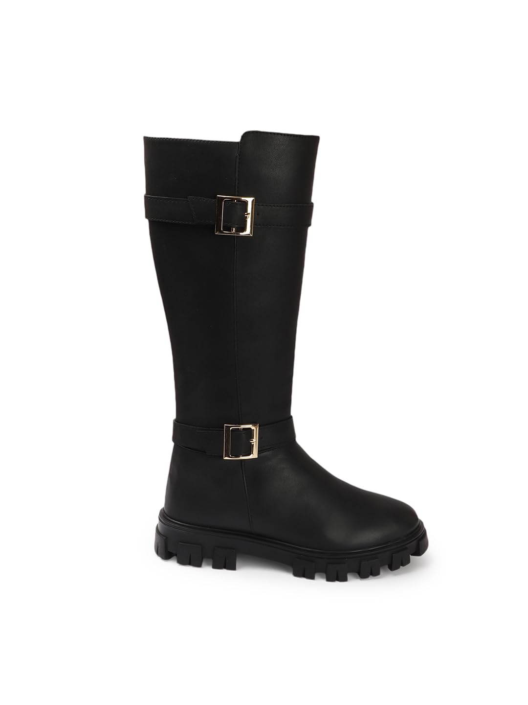 Elevate your footwear collection with Carlton London Women’s Black Knee-High Boots. Featuring a sleek design with gold buckle detailing, these boots combine fashion and functionality effortlessly. The rugged sole provides stability, while the stylish aesthetic makes them a versatile choice for any occasion.