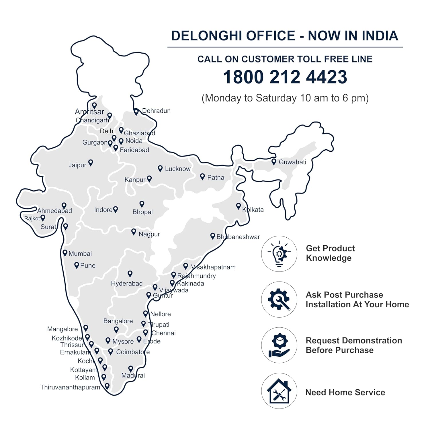 DEDICATED INDIA OFFICE: With our 90+ offices across India, we provide door-step service to all our users. We, at De’longhi, are committed to “Keep Customers Interest Ahead of All.” Feel free to contact Customer Care for any Service Requirements.