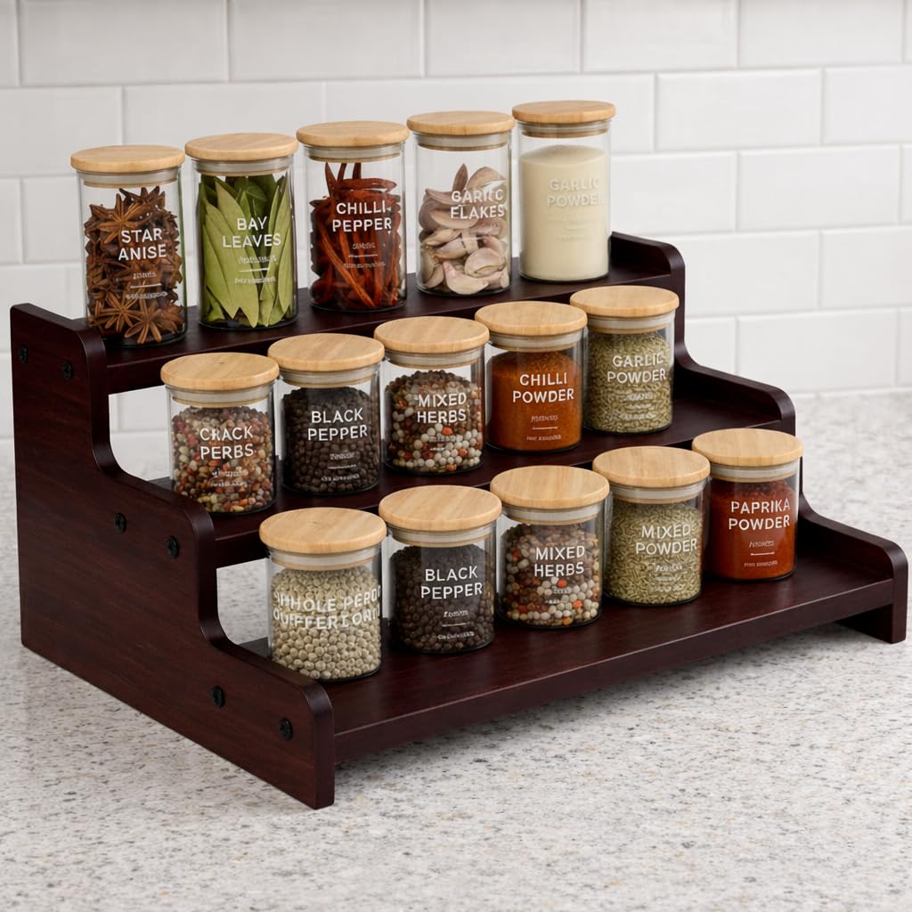 This Firebees 3-tier wooden kitchen organiser rack is the perfect solution for maximising your counter top space whilst keeping your kitchen essentials neatly arranged. Crafted from quality wood with a rich dark brown finish, this versatile storage stand combines functionality with decorative appeal. The three-tiered design provides ample space for organising spices, condiments, jars, bottles, and other kitchen items, making everything easily accessible when you need it. The stepped shelf riser configuration ensures that items on lower tiers remain visible and within reach, eliminating the frustration of searching through cluttered cupboards. This wooden rack works brilliantly as a masala rack, allowing you to display your spice collection in style whilst saving valuable counter and cupboard space. The sturdy construction ensures stability even when fully loaded, whilst the natural wood grain adds warmth and character to your kitchen décor. Whether you’re looking to declutter your work surface, create an organised pantry display, or simply add a touch of rustic charm to your cooking space, this kitchen shelf organiser delivers on all fronts. Easy to clean and maintain, this storage stand is a practical addition to any modern or traditional kitchen setting.