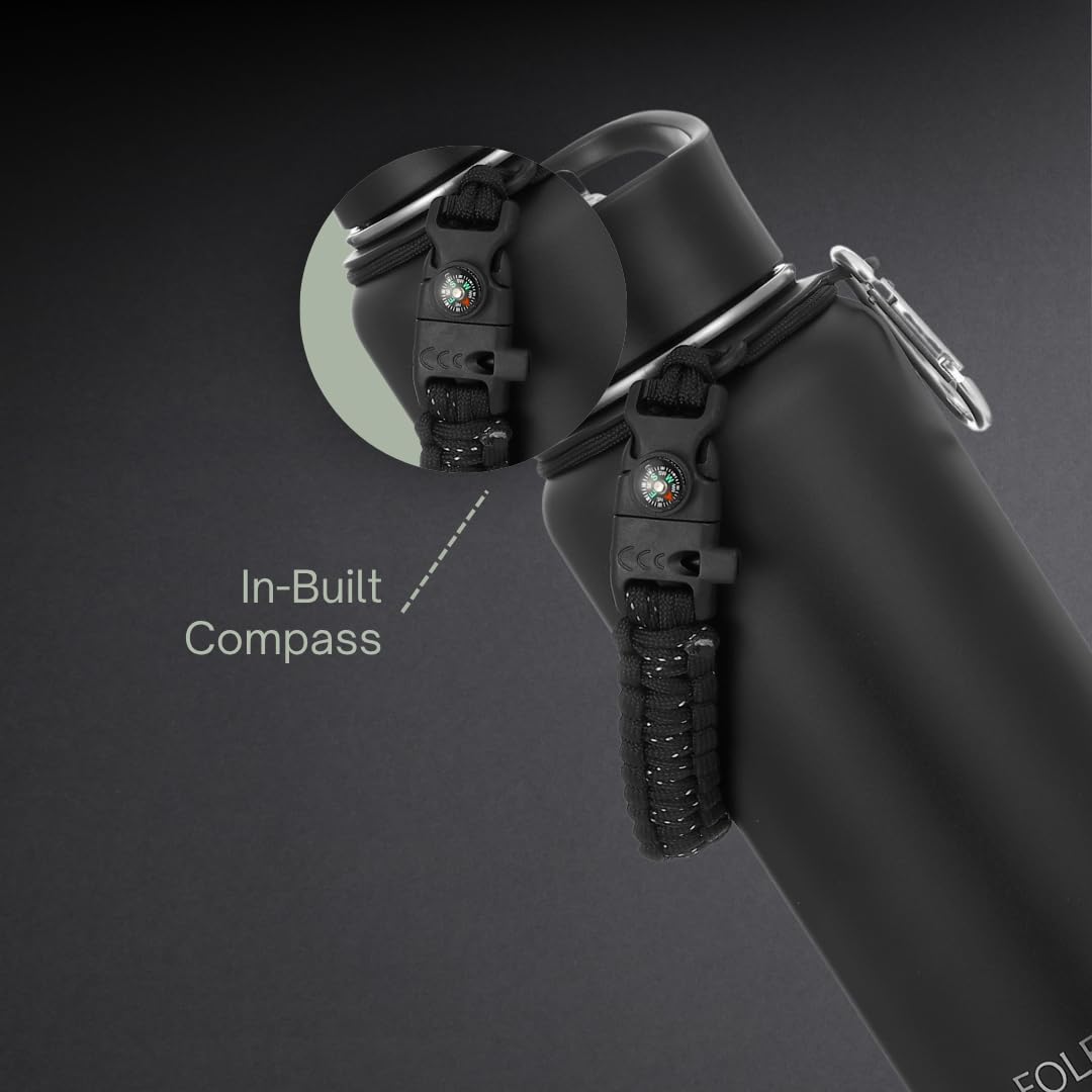 Folello 1000 ml Stainless Steel Water Bottle, Vacuum Insulated Flask with Strap to Carry – 24 Hours Hot & Cold, 2 Lids, Rope Handle, Compass & Carabiner Hook for Hiking, Trekking & Travel (Black)