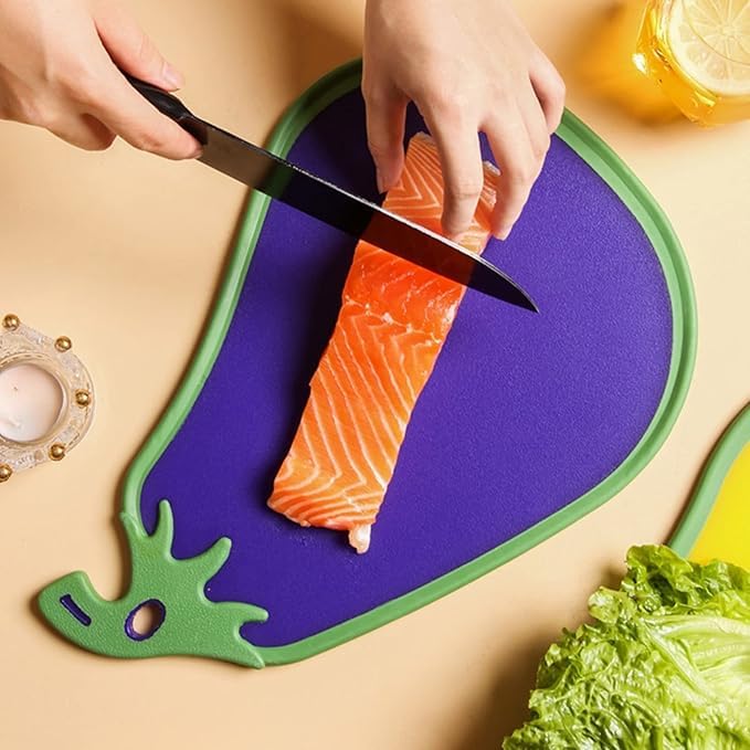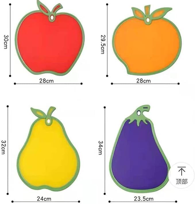 FUN FRUIT SHAPES: This set of cutting boards comes in 4 delightful fruit and vegetable shapes — apple (28×30 cm), orange (28×29.5 cm), pear (24×32 cm), and eggplant (23.5×34 cm) — adding a cheerful touch to your kitchen.