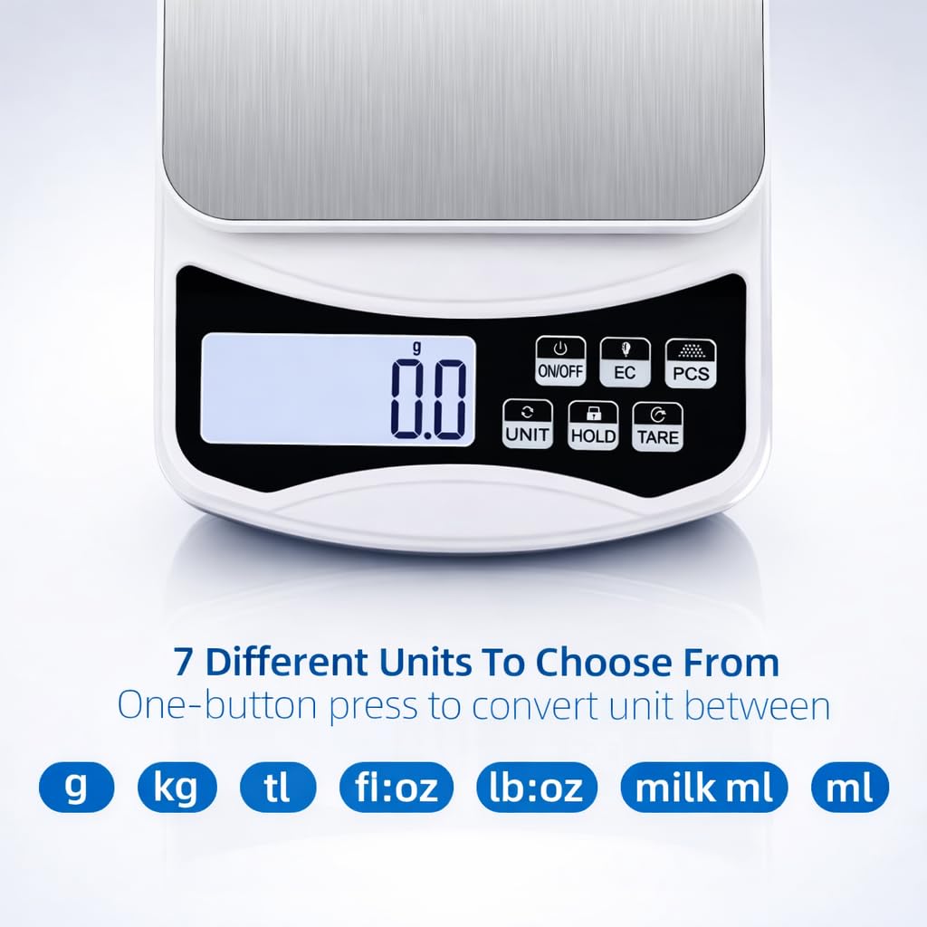 VERSATILE MEASUREMENT UNITS: Supports 7 different units of measurement including grammes, kilogrammes, ounces, pounds, and millilitres, allowing you to switch between units based on your recipe requirements