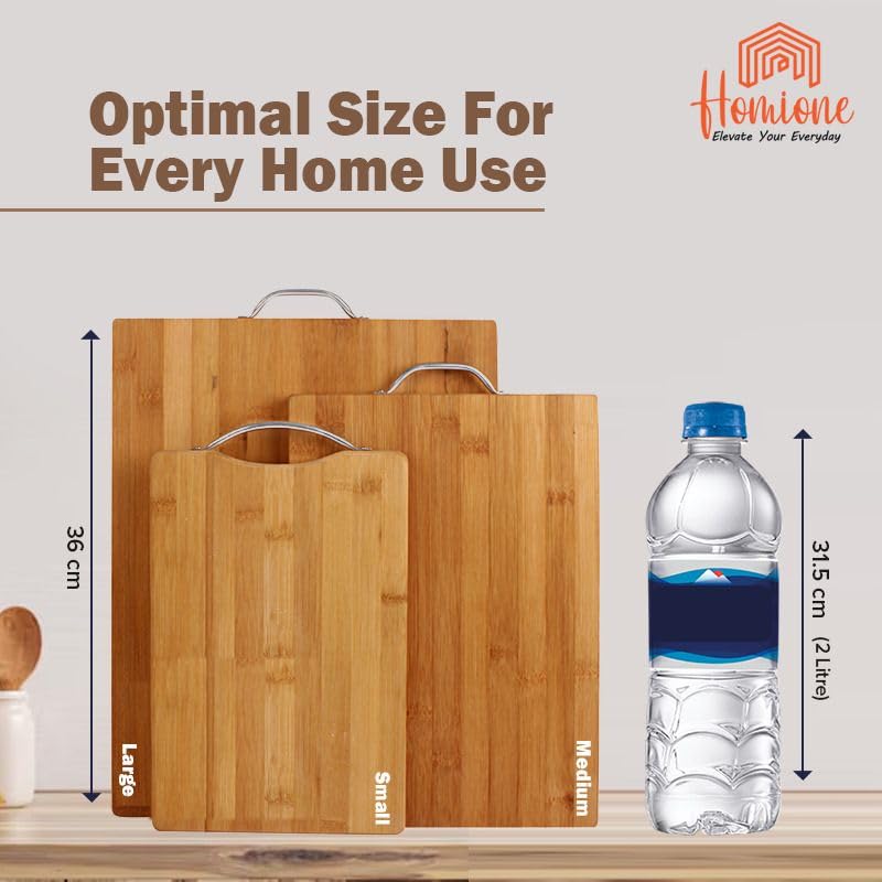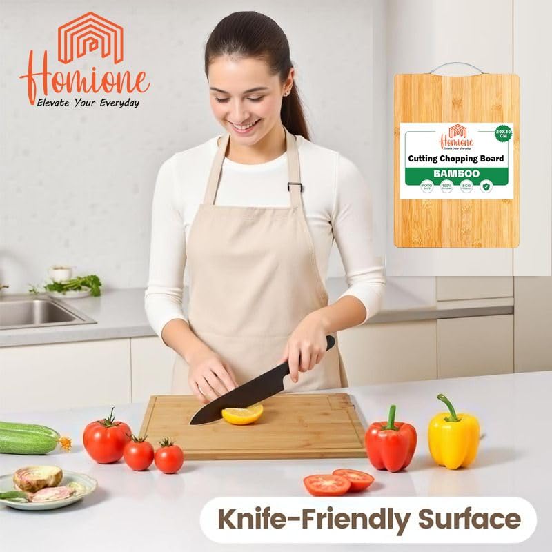 Upgrade your kitchen with the HOMIONE – ELEVATE YOUR EVERYDAY Bamboo Wooden Chopping Board, specially designed for daily use, durability, and hygiene. Made from 100% natural bamboo, this board offers a strong, smooth, and food-safe surface for chopping vegetables, fruits, bread, cheese, and even boneless meat. The compact 30 x 20 cm size makes it ideal for small kitchens, quick meal prep, or serving snacks. With a 2.0 cm thick construction, it stays sturdy during chopping and lasts longer than thin wooden or plastic boards. Bamboo is naturally antibacterial, moisture-resistant, and easy to clean, making it more hygienic than regular wooden boards. It is also gentle on knives, preventing your blades from dulling quickly. Whether you are a home cook or a professional, this lightweight, durable, and eco-friendly cutting board is the perfect addition to your kitchen.