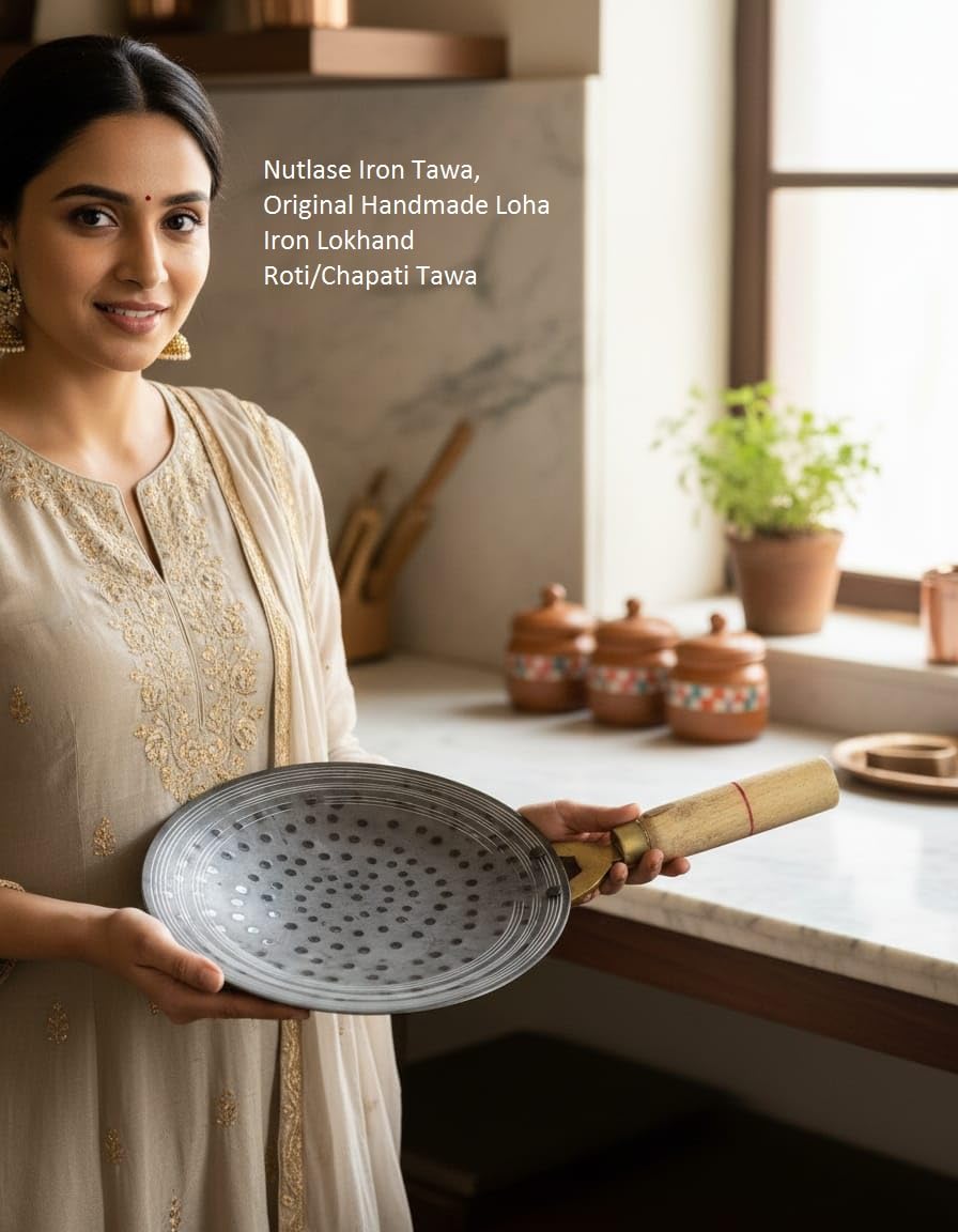 Nutlase Iron Tawa, Original Handmade Loha Iron Lokhand Roti/Chapati Tawa with Wooden Handle