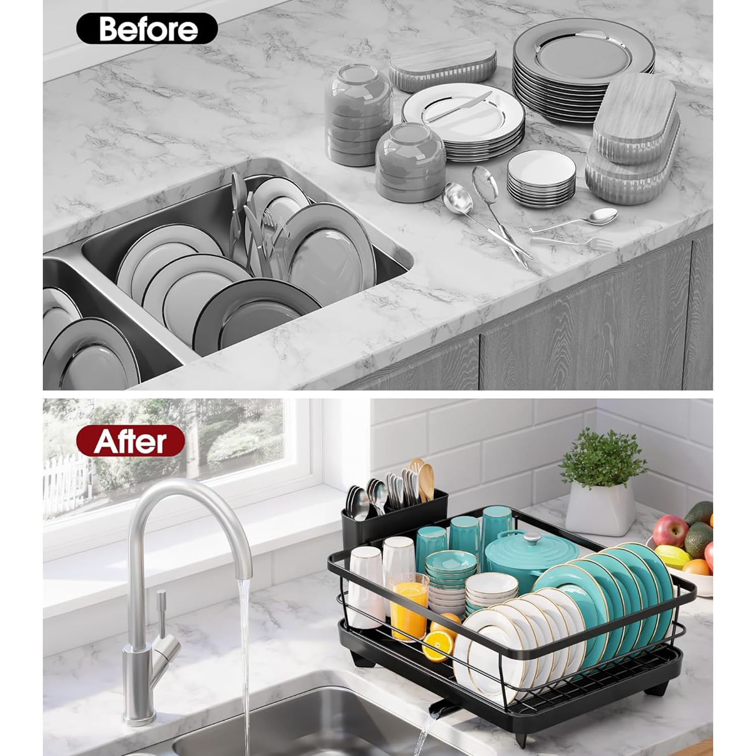 𝐌𝐮𝐥𝐭𝐢𝐩𝐮𝐫𝐩𝐨𝐬𝐞 𝐊𝐢𝐭𝐜𝐡𝐞𝐧 𝐃𝐢𝐬𝐡 𝐃𝐫𝐚𝐢𝐧𝐞𝐫: Designed as an all-in-one kitchen organizer featuring a dish drying rack, utensil basket, cutlery holder, and vessel drainer stand. Ideal for drying plates, bowls, cups, glasses, spoons, forks, and kitchen tools.