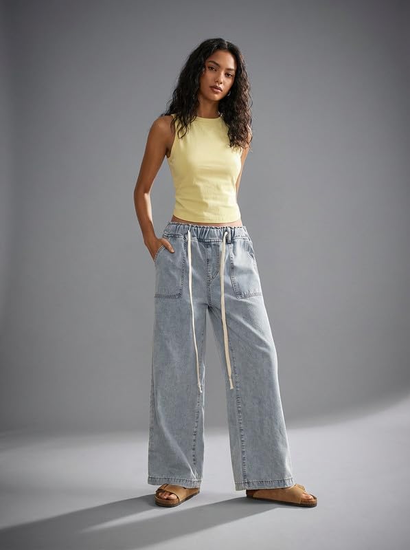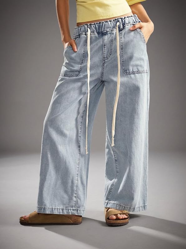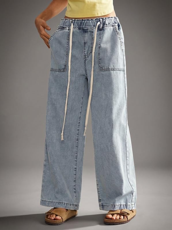 Upgrade your everyday wardrobe with these stylish Korean Women Wide Leg Jeans, designed for comfort, versatility, and modern fashion appeal. Inspired by Korean street style, these jeans feature a relaxed loose fit that gives you a trendy yet effortless look suitable for daily wear, college, shopping, travel, or casual outings. Crafted from soft washed denim fabric, these jeans feel lightweight, breathable, and gentle on the skin, making them ideal for all seasons. The high waist design offers a flattering silhouette while providing extra comfort and tummy support. An elastic waistband with an adjustable drawstring ensures a customized fit for different body shapes and easy wear without buttons or zippers. The wide leg cut adds a chic, flowy vibe and allows free movement throughout the day. Functional side pockets provide practical storage for your phone, keys, or small essentials without compromising style. These Korean-style jeans can be effortlessly paired with crop tops, t-shirts, hoodies, sweaters, or sneakers for a casual streetwear look, or dressed up with sandals and accessories for a smart-casual outfit. Perfect for women and girls who love trendy yet comfortable denim, these jeans are a must-have staple for your modern wardrobe.