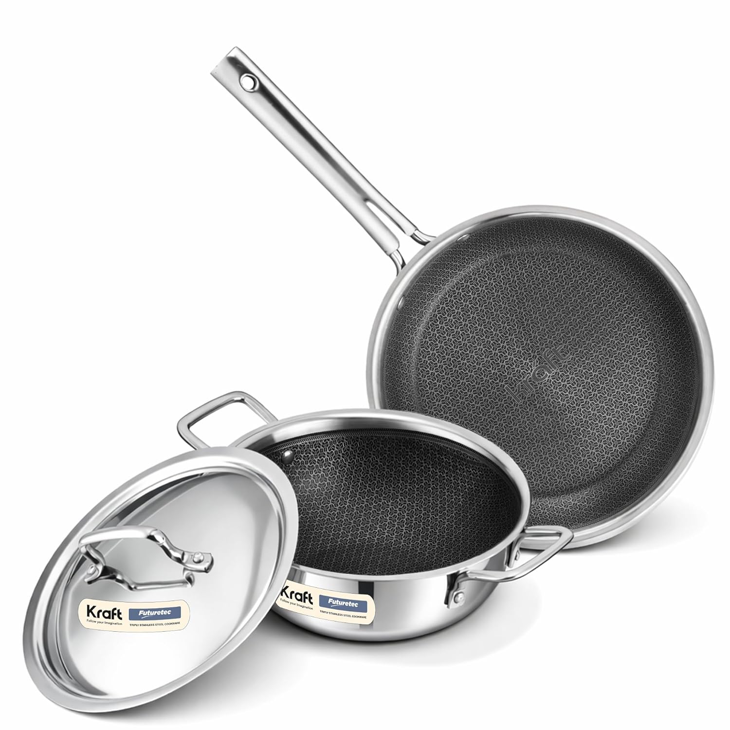 𝗩𝗘𝗥𝗦𝗔𝗧𝗜𝗟𝗘 𝗖𝗢𝗢𝗞𝗪𝗔𝗥𝗘 𝗦𝗘𝗧:The Futuretec Pro Set includes a 22 cm Kadai and a 22 cm Frypan, both featuring a common lid. This versatile set is perfect for a wide range of cooking tasks, from sautéing to deep frying, offering convenience and flexibility in your kitchen.