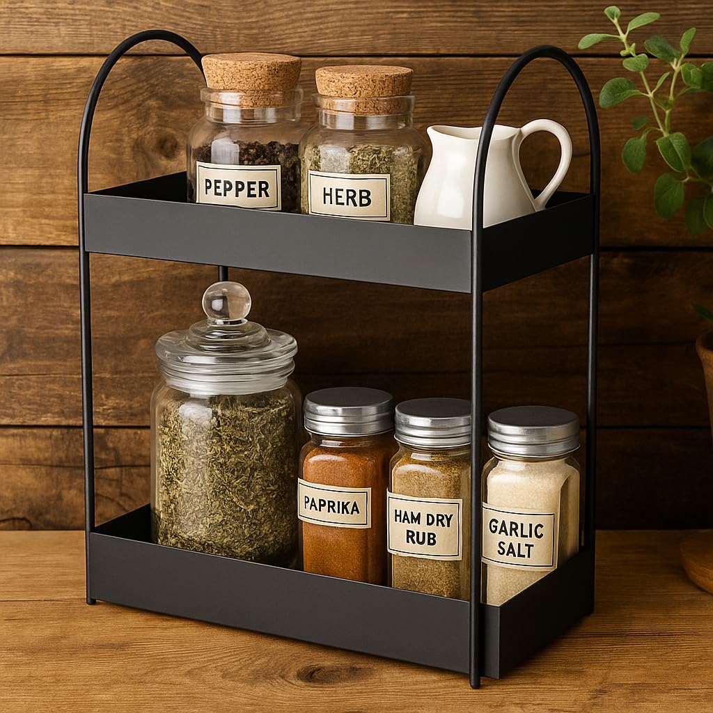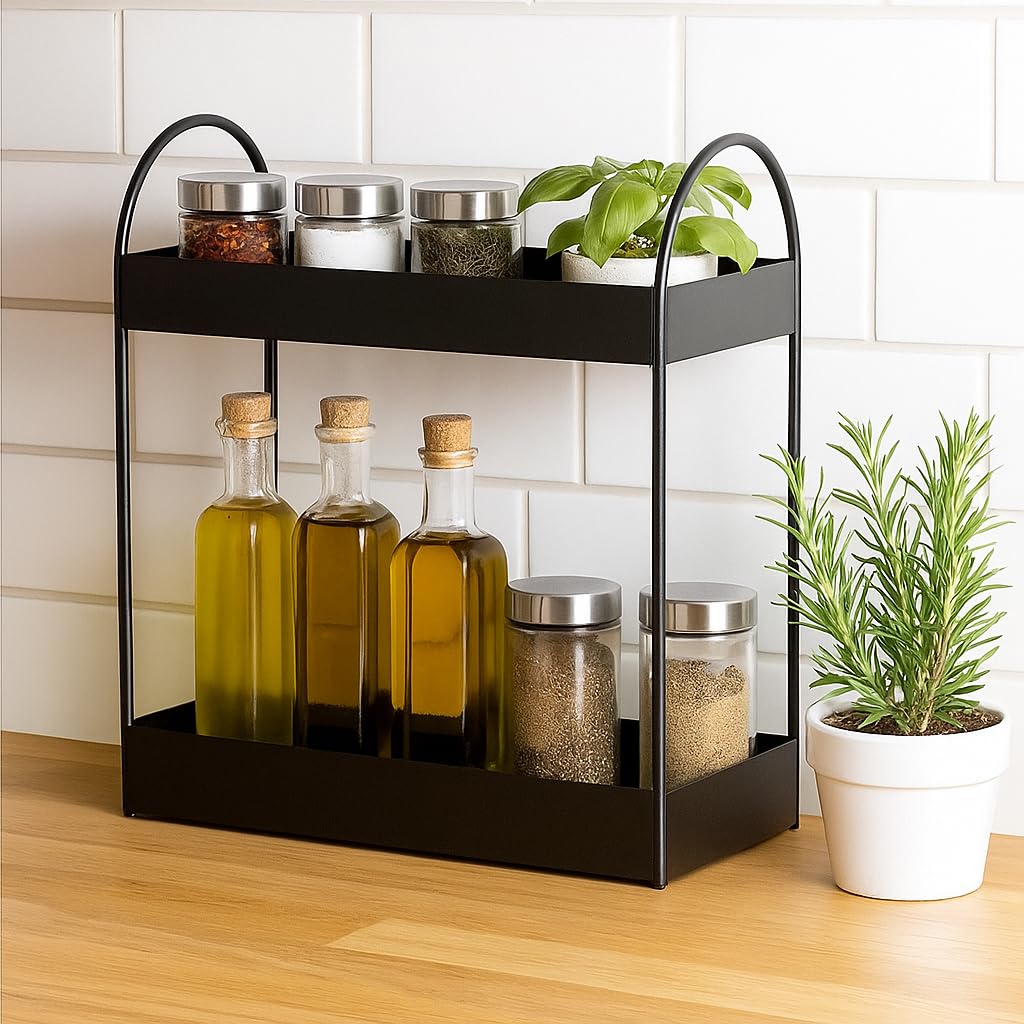 Premium Powder-Coated Crafted from high-quality metal with a protective coating that prevents rust, resists moisture, and ensures long-lasting durability. Dual-Tier Spacious Shelves Designed with two wide storage levels to neatly organize cosmetics, spices, toiletries, jars, or daily essentials. Sleek Minimalist Black Finish Features a modern matte black look that blends effortlessly with kitchen, bathroom, vanity, or office décor. Ready-to-Use Design No drilling or assembly required; simply place it on any countertop for instant organization. Space-Saving Structure Smart vertical design maximizes storage while occupying minimal counter space, making it perfect for small areas.
