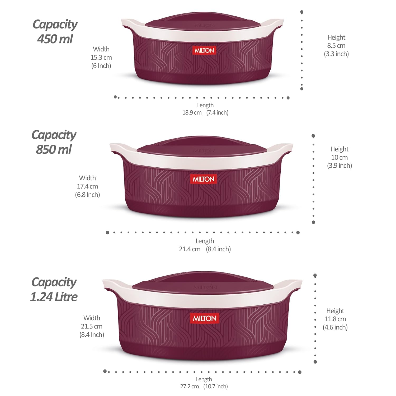 Milton Evoke Jr. Gift Set PU Insulated Inner Stainless Steel Casserole, Set of 3 (450 ml, 850 ml, 1240 ml), Maroon,BPA Free,Food Grade,Hot and Cold,Easy to Carry, Easy to Store,Chapati,Roti,Curd Maker