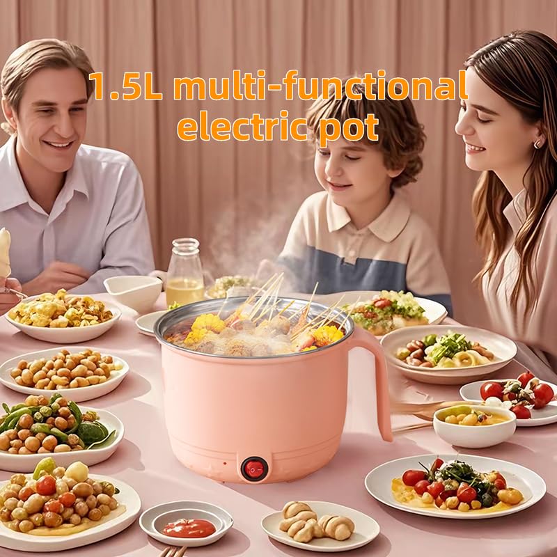 Multifunctional Electric Cooking Pot – This 1.5L electric cooking pot is perfect for a wide range of cooking needs, including boiling noodles, preparing soup, cooking rice, steaming vegetables, frying eggs, deep-frying snacks, making fondue, slow cooking, and more. Its versatile design makes it an essential kitchen appliance for home, office, dorm rooms, and travel.