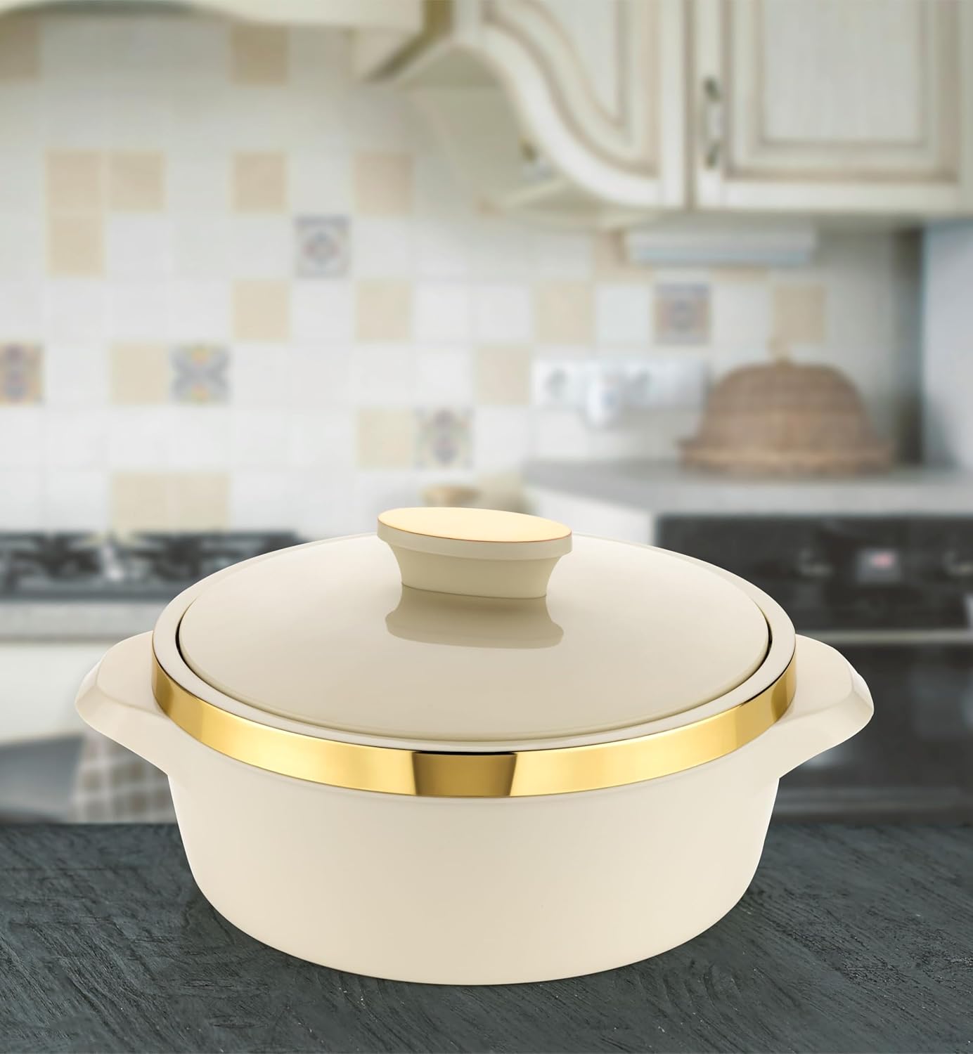 Double walled Inner stainless-steel casserole keeps food hot and fresh for hours. The Exclusive metallized foil, unique design and elegant shape enhances your dining décorum and thus makes it a must-have casserole for your home.