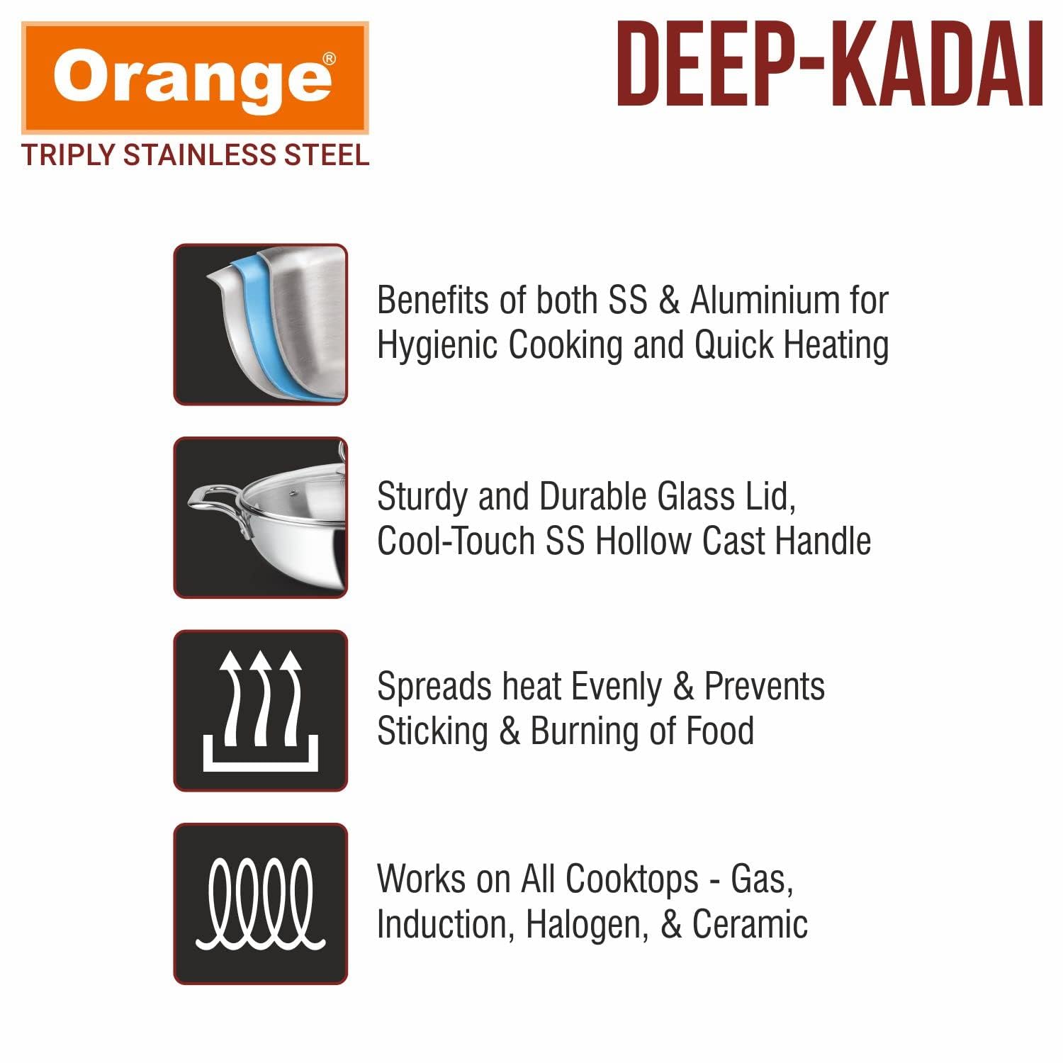 📦 Complete Cooking Set – Includes 1 premium triply stainless steel kadai and 1 sturdy glass lid for everyday kitchen needs.