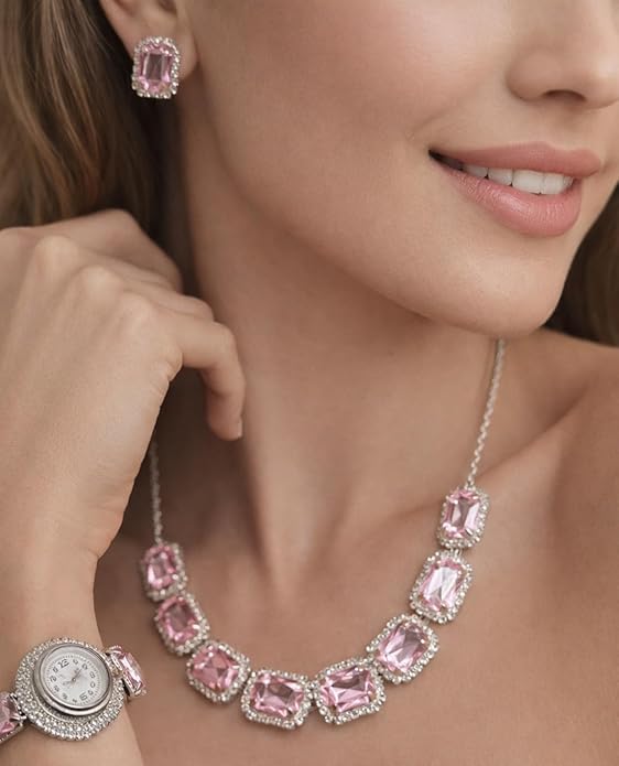 This stunning pink crystal jewellery set is the perfect way to add a touch of glamour to any outfit. The four-piece collection includes a coordinated necklace, earrings, bracelet, and watch, all featuring beautiful pink rectangular crystals surrounded by sparkling rhinestone halos in a classic silver-tone setting. Each piece showcases emerald-cut pink stones that catch the light beautifully, creating an eye-catching display that’s perfect for special occasions or elevating your everyday style. The necklace features a statement design with multiple crystals linked together, whilst the matching stud earrings provide an elegant finishing touch. The bracelet incorporates the same crystal design with an integrated watch face encircled by shimmering rhinestones, combining fashion with function. This versatile set makes an excellent gift for birthdays, anniversaries, or celebrations, and can be worn together as a complete ensemble or mixed and matched with other accessories. The adjustable chain on the necklace and bracelet ensures a comfortable fit for various sizes.