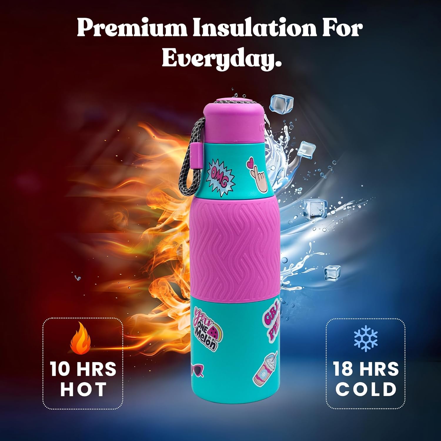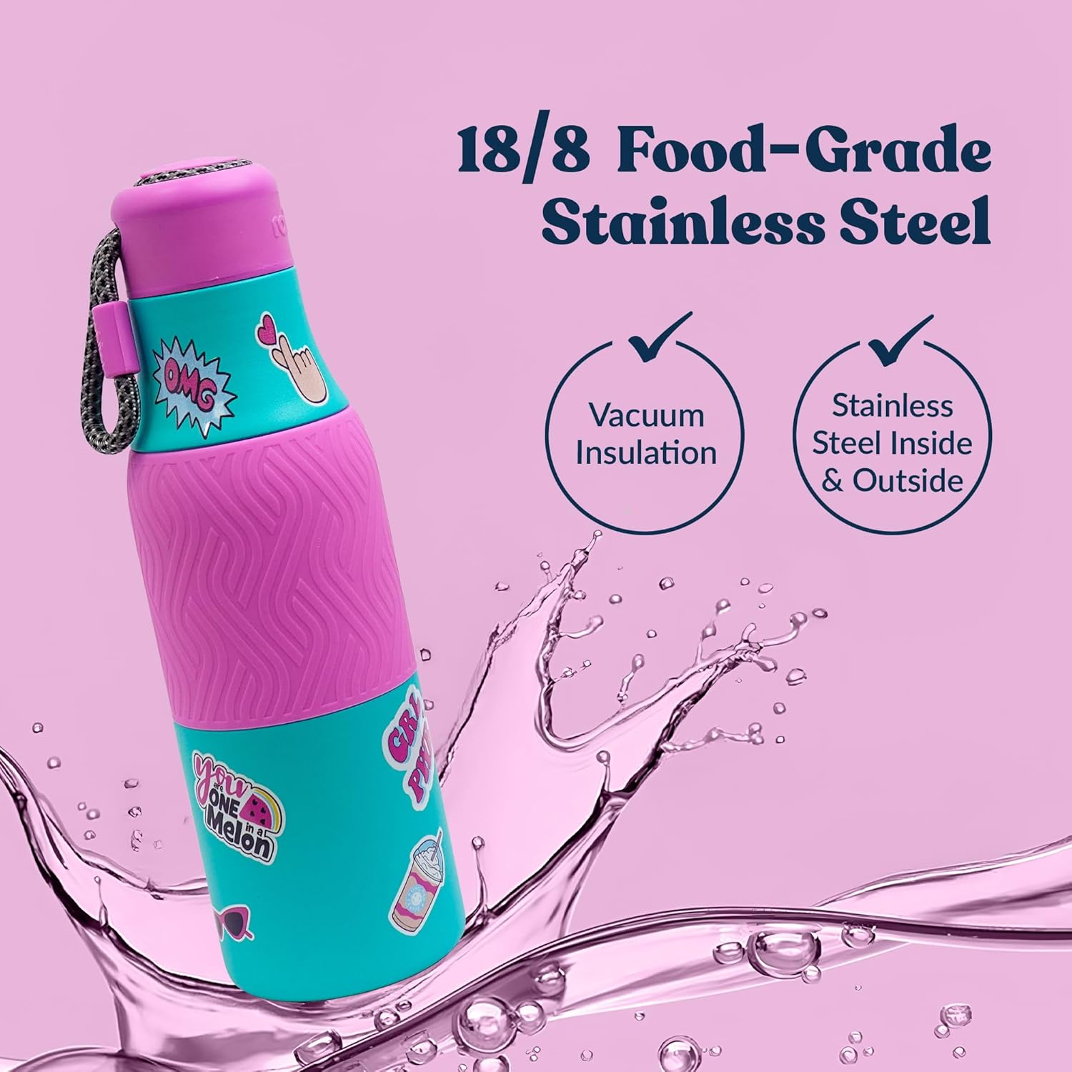 ✅ FUN STICKER DESIGNS WITH SILICONE GRIP – Colorful sticker prints add a fun look kids love, while the silicone grip ensures easy handling, making it the perfect kids water bottle for daily school use.