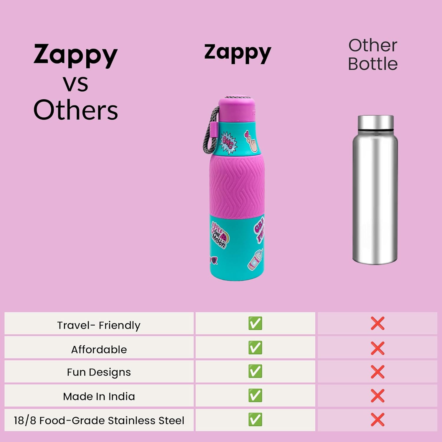 ✅ FOOD-GRADE 18/8 STAINLESS STEEL – This Zappy steel water bottle for kids is made from premium food-grade stainless steel, ensuring durability, safety, and a healthy drinking experience for everyday school use.
