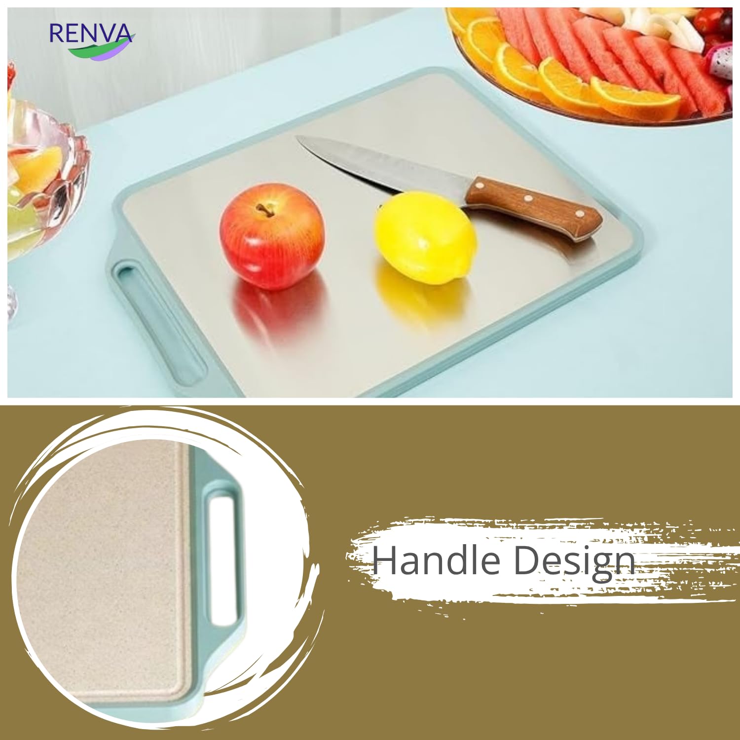 【SAFE AND EASIER TO HANDLE 】Unlike glass or titanium cutting board,equipped with a stainless steel handle, allows for a secure grip, ensuring that the cutting board doesn’t slip or move. Additionally, the handle provides a convenient way to hang and store the board.