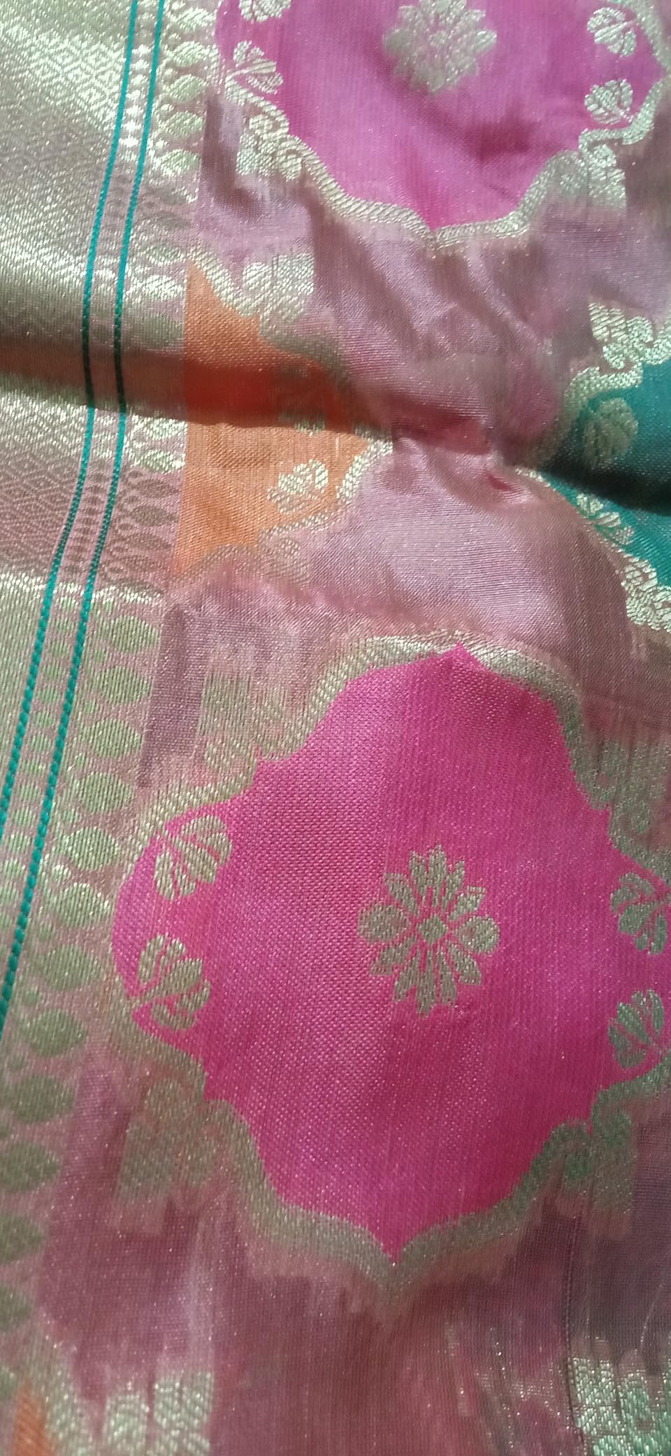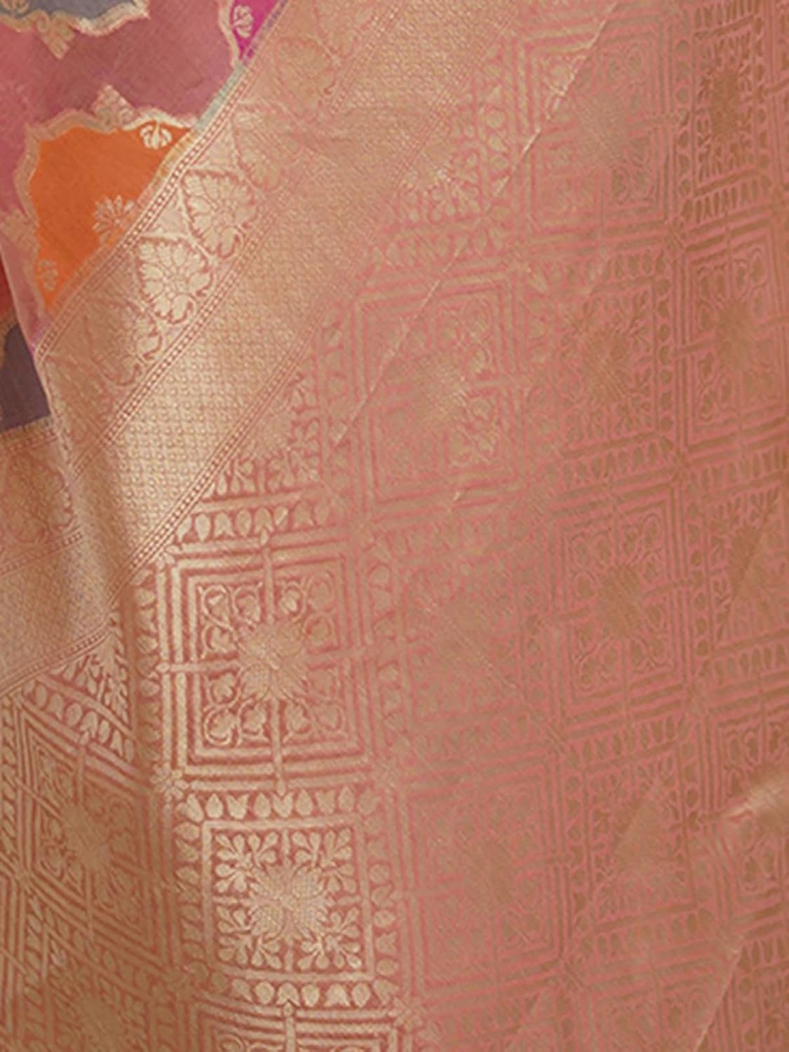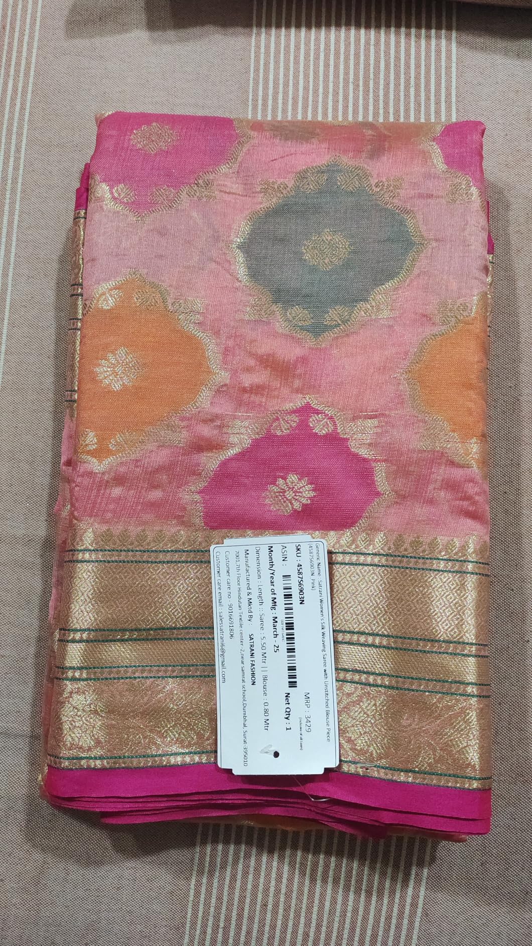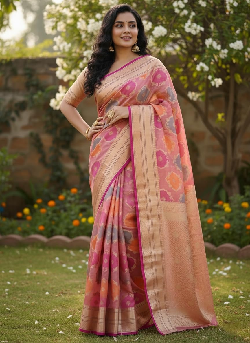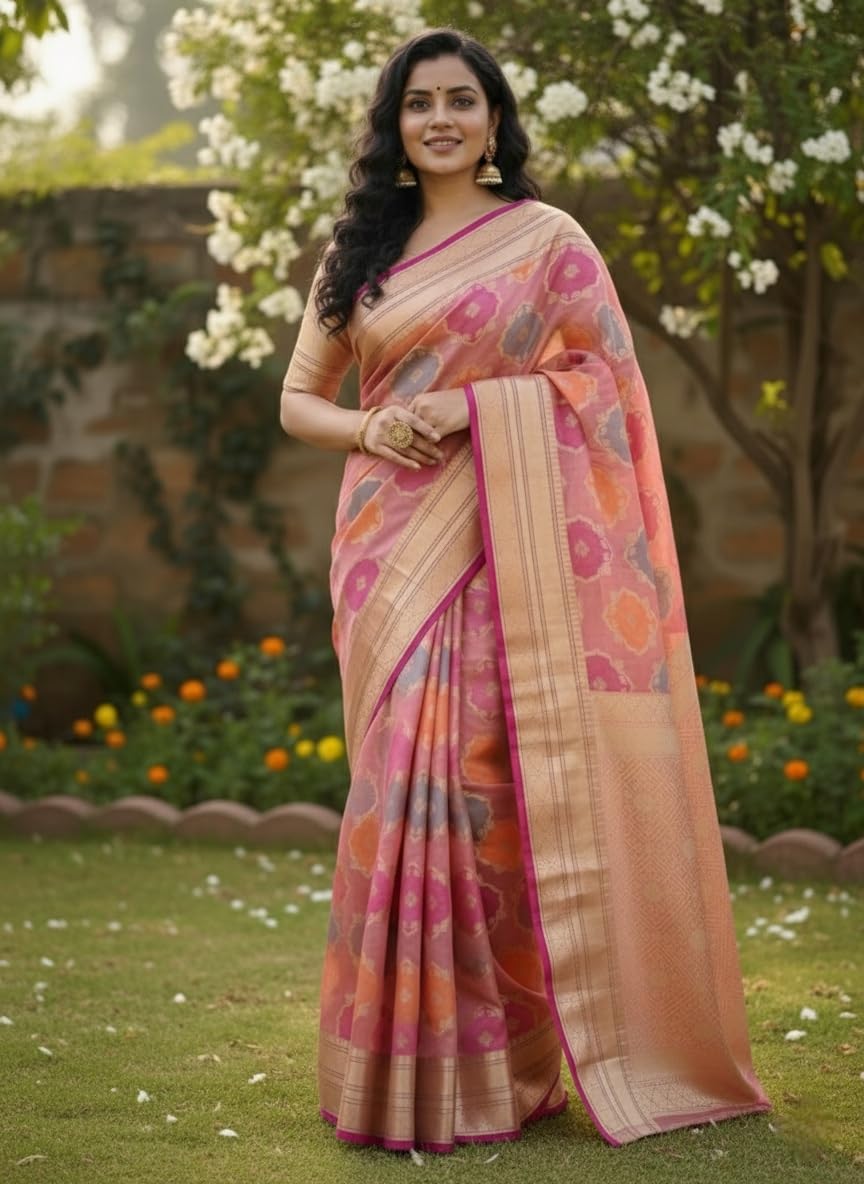 This saree is very beautiful. The peachy-pink colors mix is looking really pretty with the flower patterns. I bought this for my wife, and she absolutely loves it. The silk fabric quality of this saree is amazing. The golden border adds a fancy touch. This saree looks amazing on my wife, and it is perfect for a special day, making her look elegant and feel lovely.