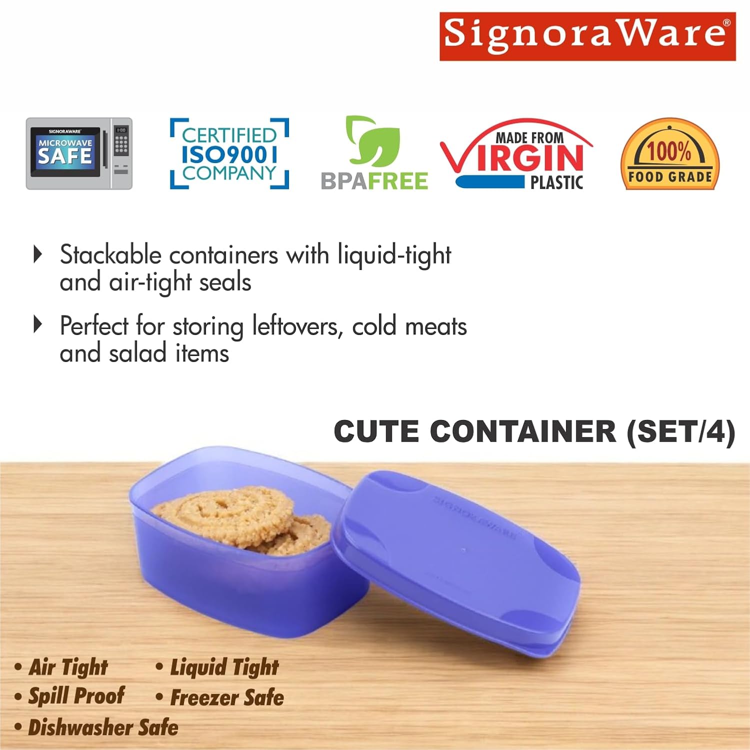 Material Details: Dimension: 9.5cm x 6.5cm x 4cm | Capacity: 100ml+100ml+100ml+100ml | The Signoraware BPA Free Plastic Storage Containers is made from BPA free Plastic which is Non toxic for health concerns, The Storage Container is lightweight & helping to keep meals Fresh.