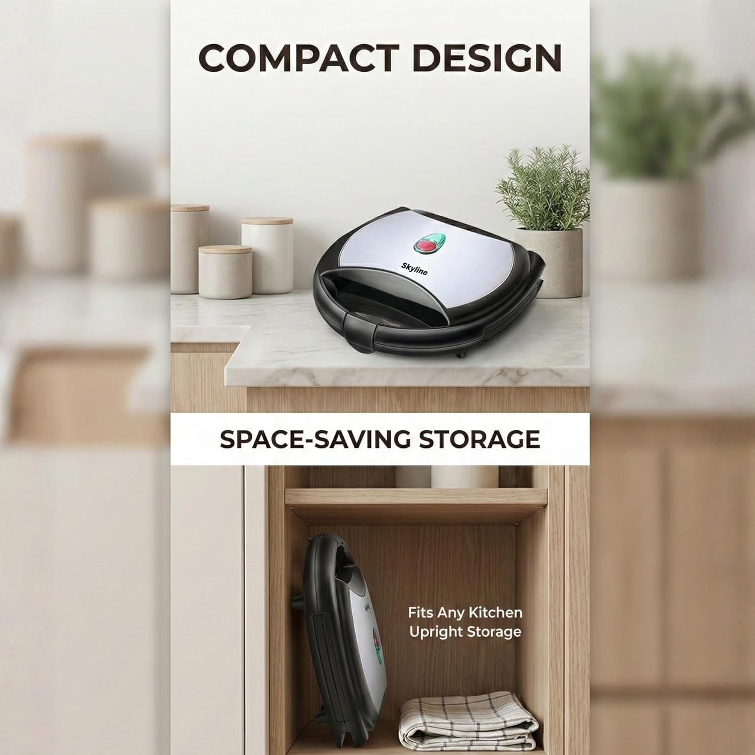 Enjoy perfectly toasted sandwiches every morning with the Skyline 2-Slice Sandwich Grill Toaster. Powered by a 750W motor, this compact yet powerful appliance offers non-stick cooking plates for easy grilling and toasting. Designed with an easy-open handle, light indicator, and thermostat control, it ensures effortless operation and precision. With both grill and triangle plate options, this elegant black stainless steel finish toaster is the ultimate breakfast companion. Non-Stick Cooking Plates: Effortless grilling and toasting with easy-to-clean non-stick plates. Thermostat Control: Ensures consistent heat for perfectly toasted sandwiches every time. User-Friendly Design: Features an easy-open handle with a light indicator and an auto-cut function for added convenience. Sleek & Stylish: Elegant black stainless steel finish adds a modern touch to your kitchen.