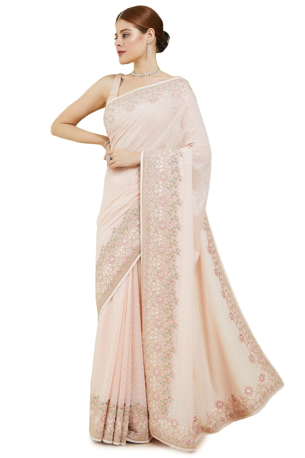 This peach georgette saree has embroidered patterns all over in self colour threads detailed with sequins. The borders have multicolour floral embroidery for a beautiful look.