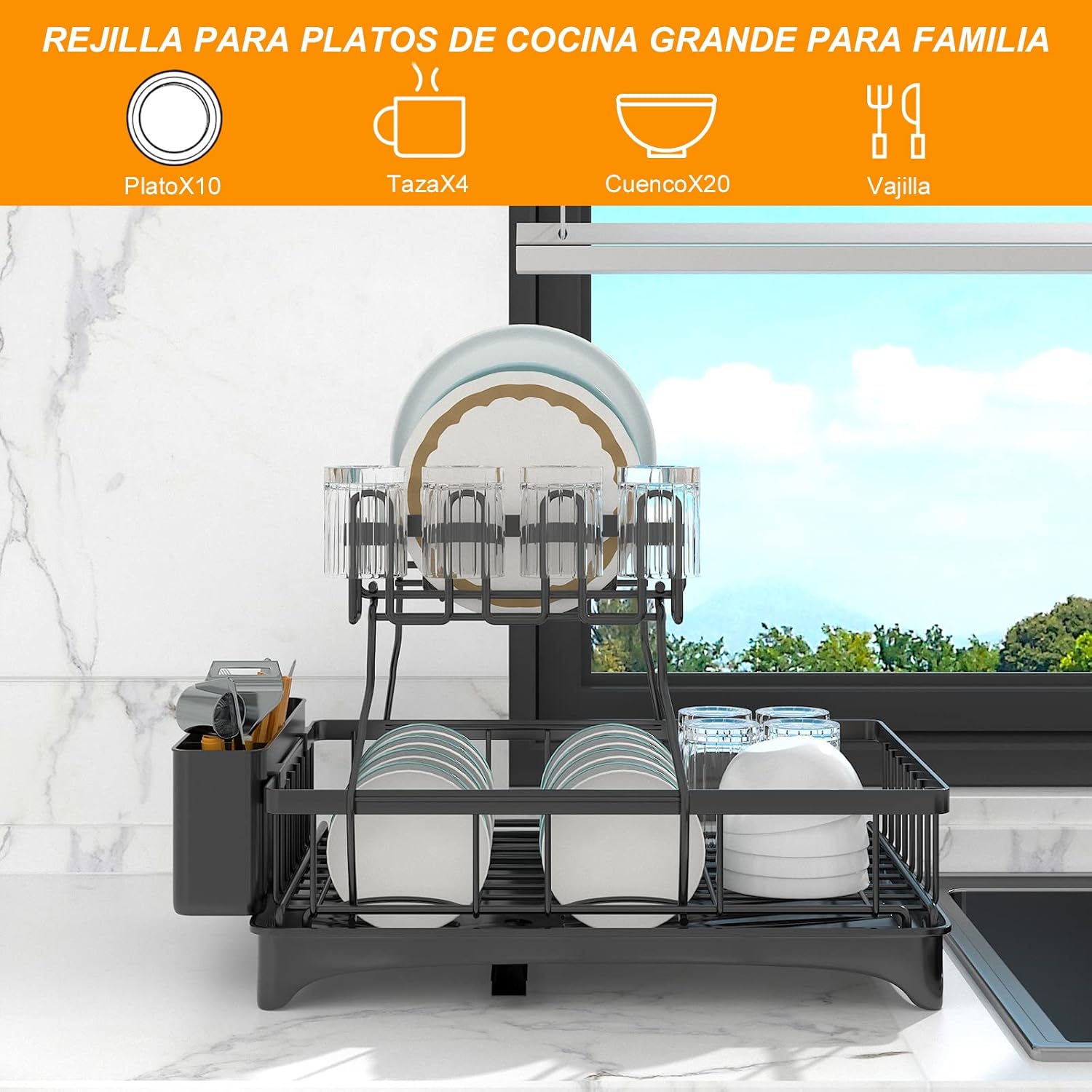 The dish drain comes with a rotating 360° nozzle that rotates to keep the water flowing directly into the sink; You can place the dish drying shelf on your kitchen counter or next to the sink.