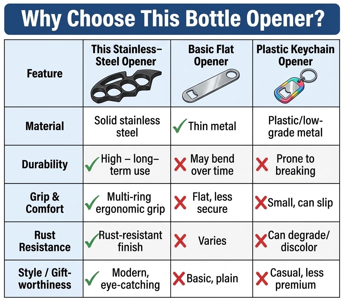 Ergonomic Four-Finger Grip: Unique ring-style handle gives strong leverage so you can pop caps in one smooth motion without hurting your hands, unlike flimsy can openers or cheap multitool keychains.