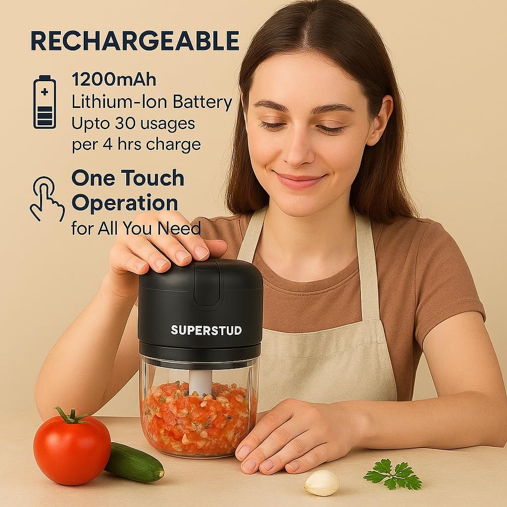 🔋 Rechargeable & Cordless – Comes with a powerful built-in battery that is USB rechargeable, allowing hassle-free chopping without messy cords.