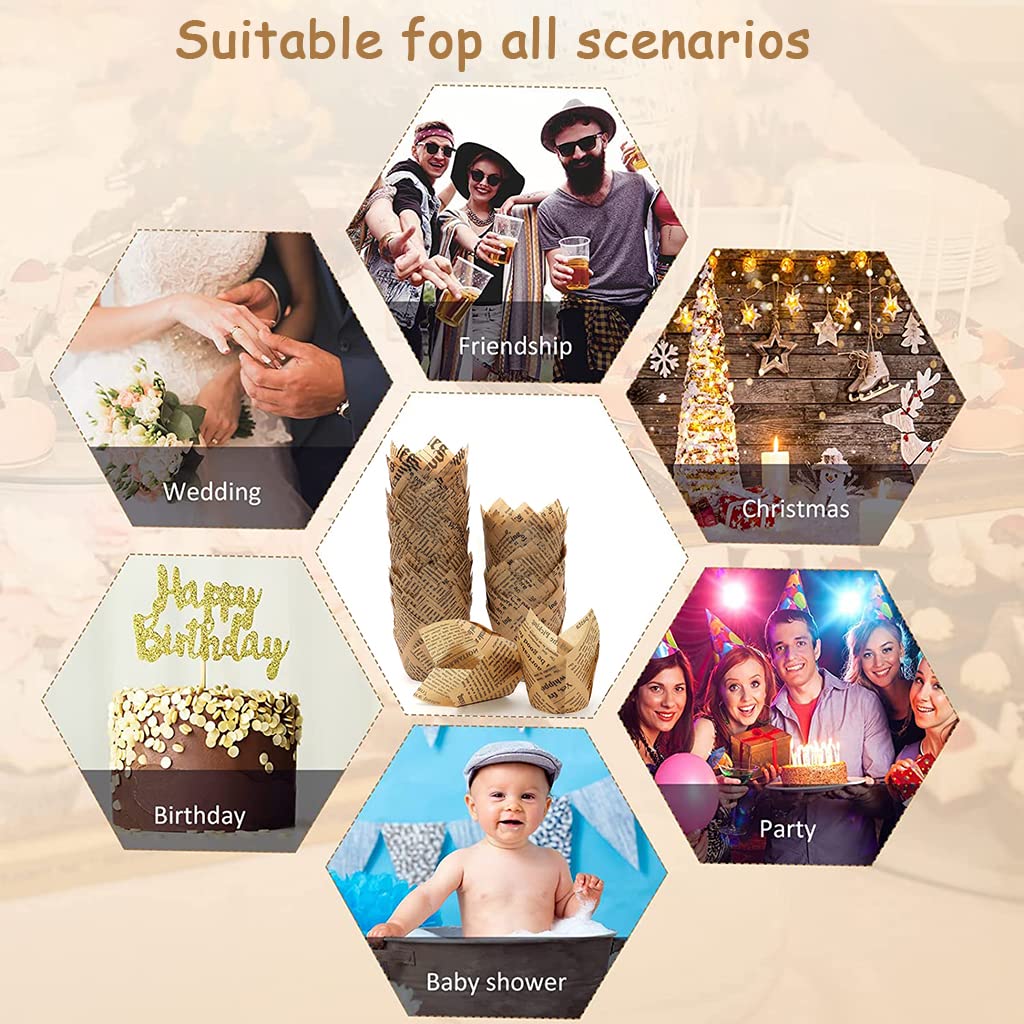 Supvox® 100Pcs Cupcake Liner, 5cm Diameter Tulip Cupcake Paper Cups, Food Grade Greaseproof Paper Baking Cups Muffin Liners Holders for Baking Weddings, Birthdays (Natural Newspaper Printed)