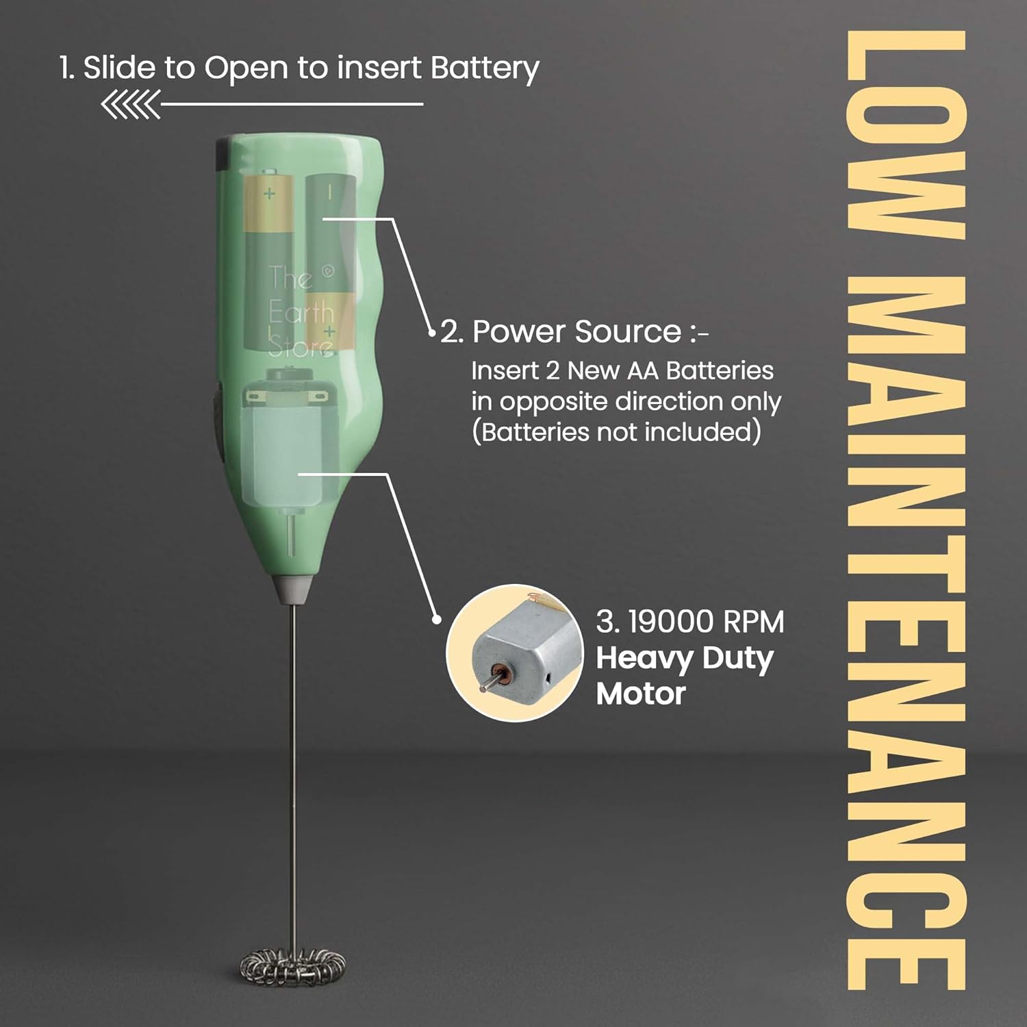 Battery Operated & Cord-Free: Powered by 2 AA batteries (not included), this frother offers complete portability and ease of use. No cords, no hassle — perfect for home, office, or even camping. Simply insert the batteries and start frothing anytime, anywhere.