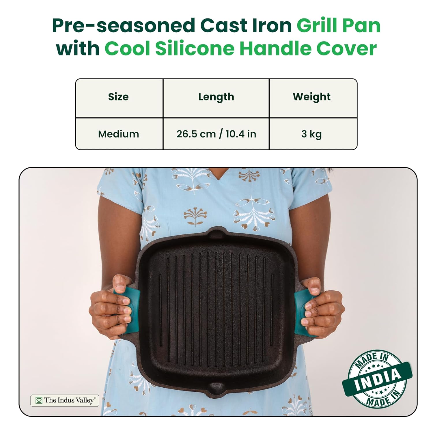 💪100% HEALTHY: The Indus Valley Premium Thick Cast Iron Grill Pan with Silicone Handle Grip is made from 100% pure cast iron that is a food-safe material.