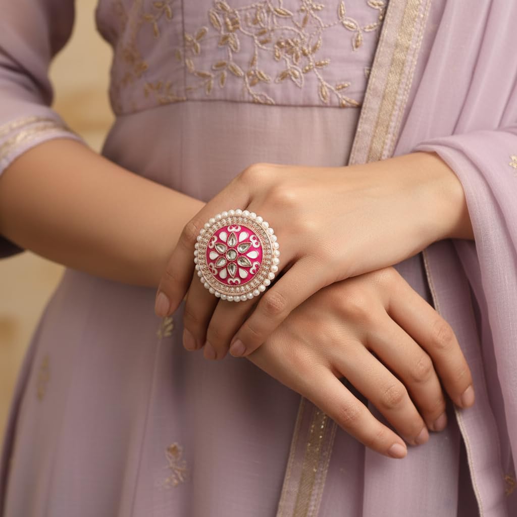 These kundan statement rings, crafted with luminous stones and a delicate pearl border, create a striking ethnic statement. Adjustable for a comfortable fit, they balance tradition with everyday elegance