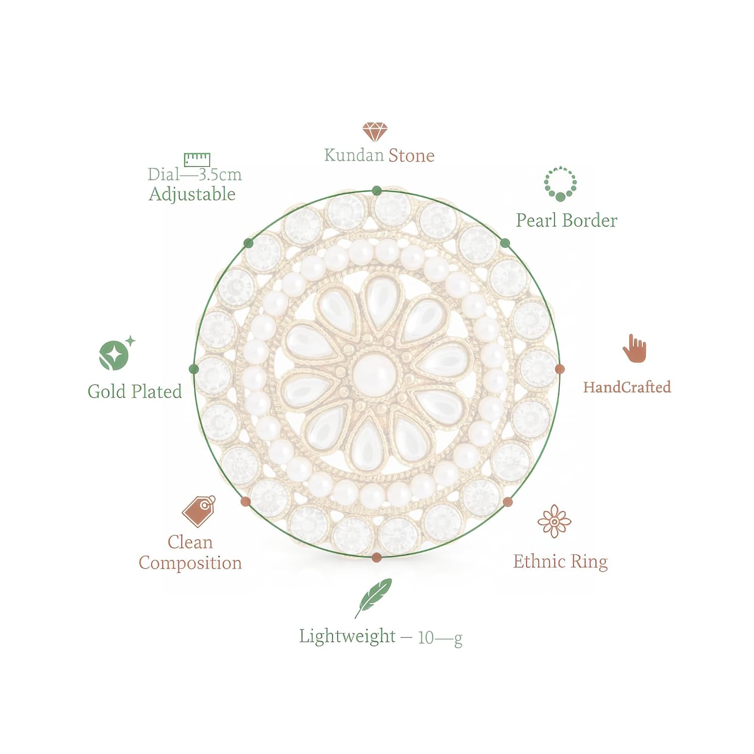 The ring is made from a durable metal alloy with gold plating, kundan-style stones, and pearl detailing.