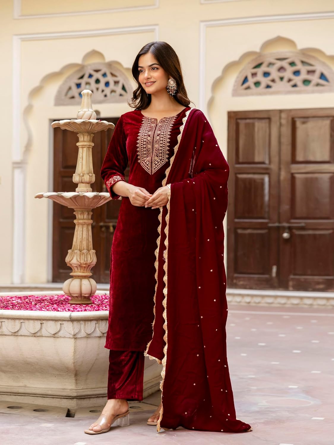 Trendmalls Maroon Velvet Kurta pant set with dupatta for women. Trendy stylish ethnic fusion Salwar Suit Set Women can wear this trendmalls embroidery kurta set for wedding wear, marriage functions, great for parties and festival occasion.