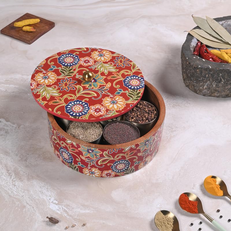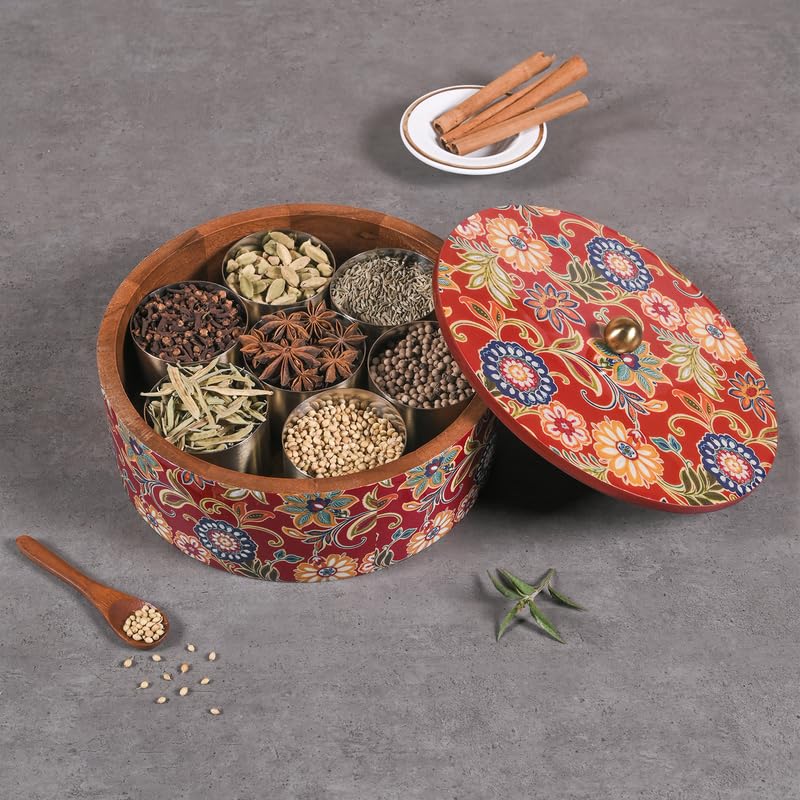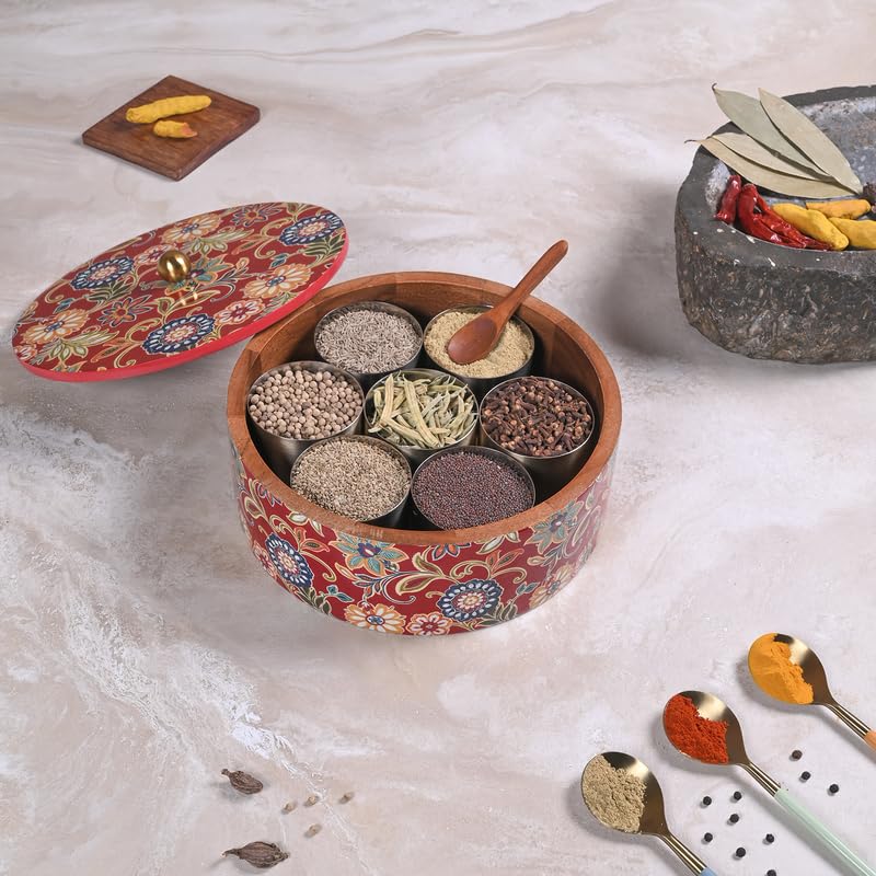 7 COMPARTMENTS FOR CONVENIENT STORAGE – Organize your spices, dry fruits, herbs, or Ayurvedic essentials in the seven individual stainless steel containers, keeping them fresh and aromatic.